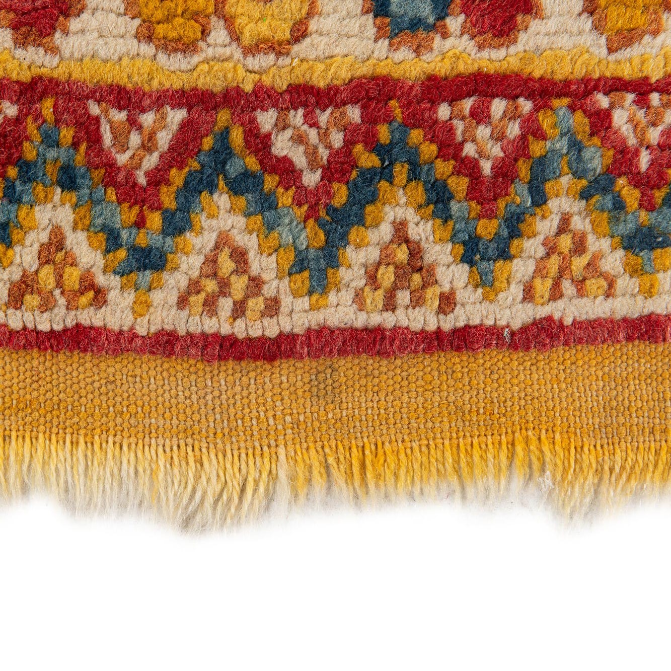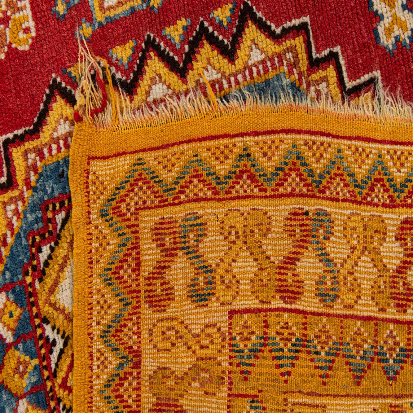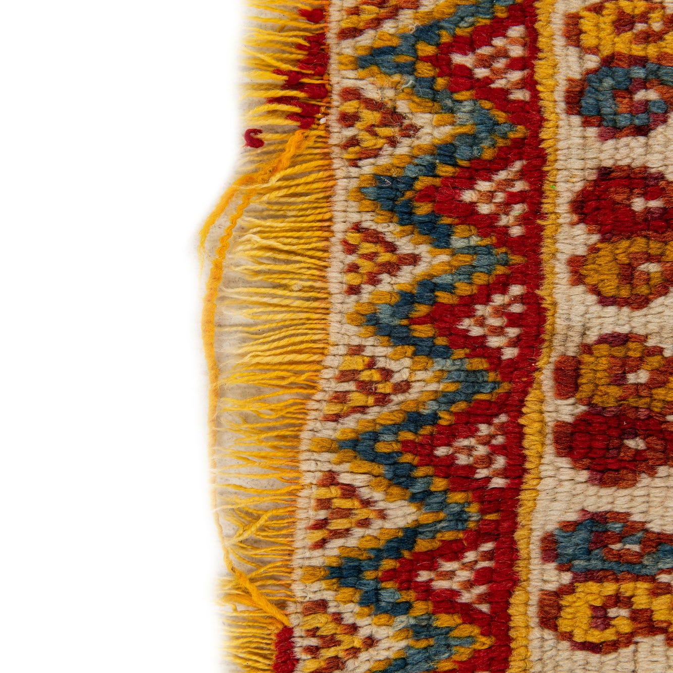 Primary color is Red. Colors in this rug include: Red, Ivory, Yellow, Black, Light Blue.