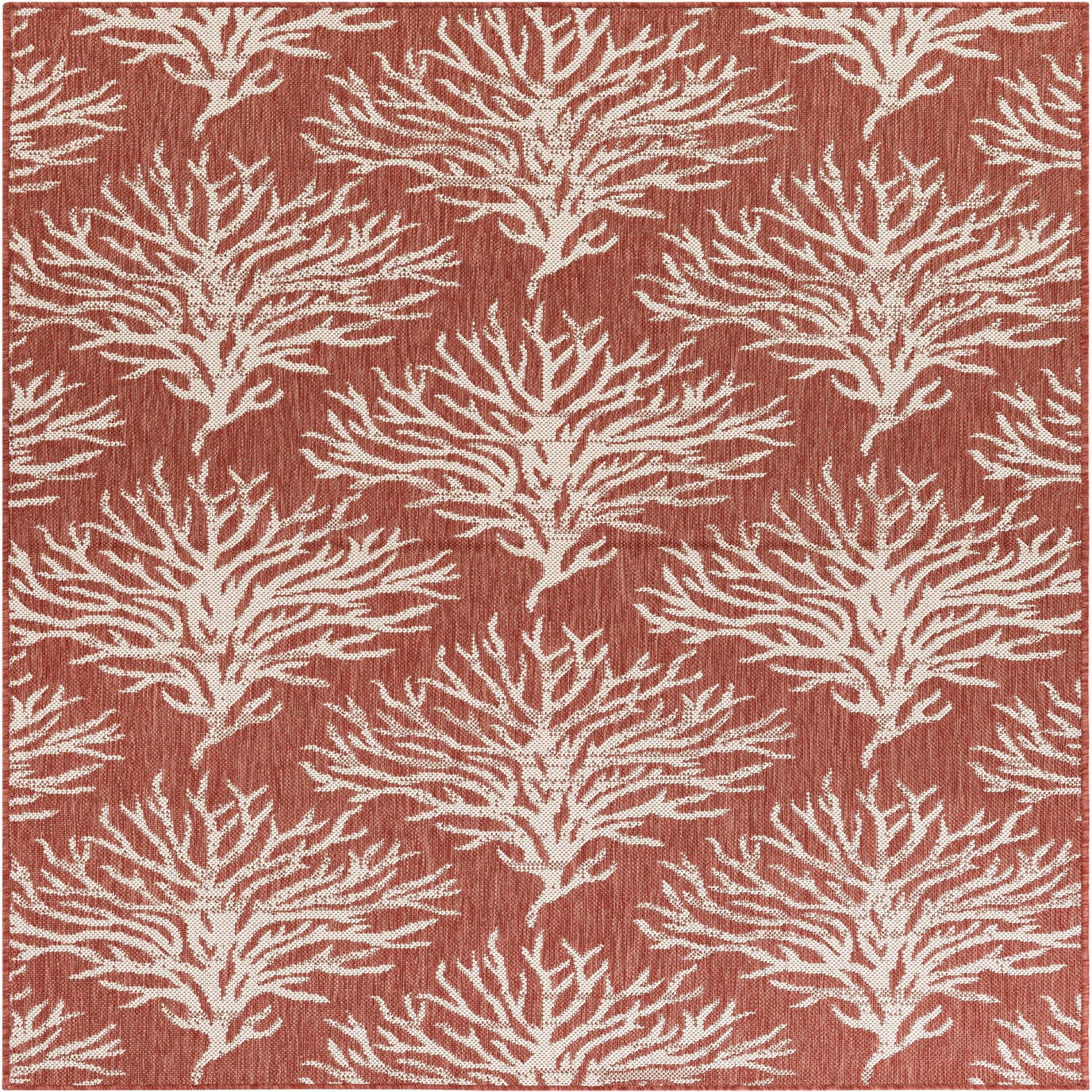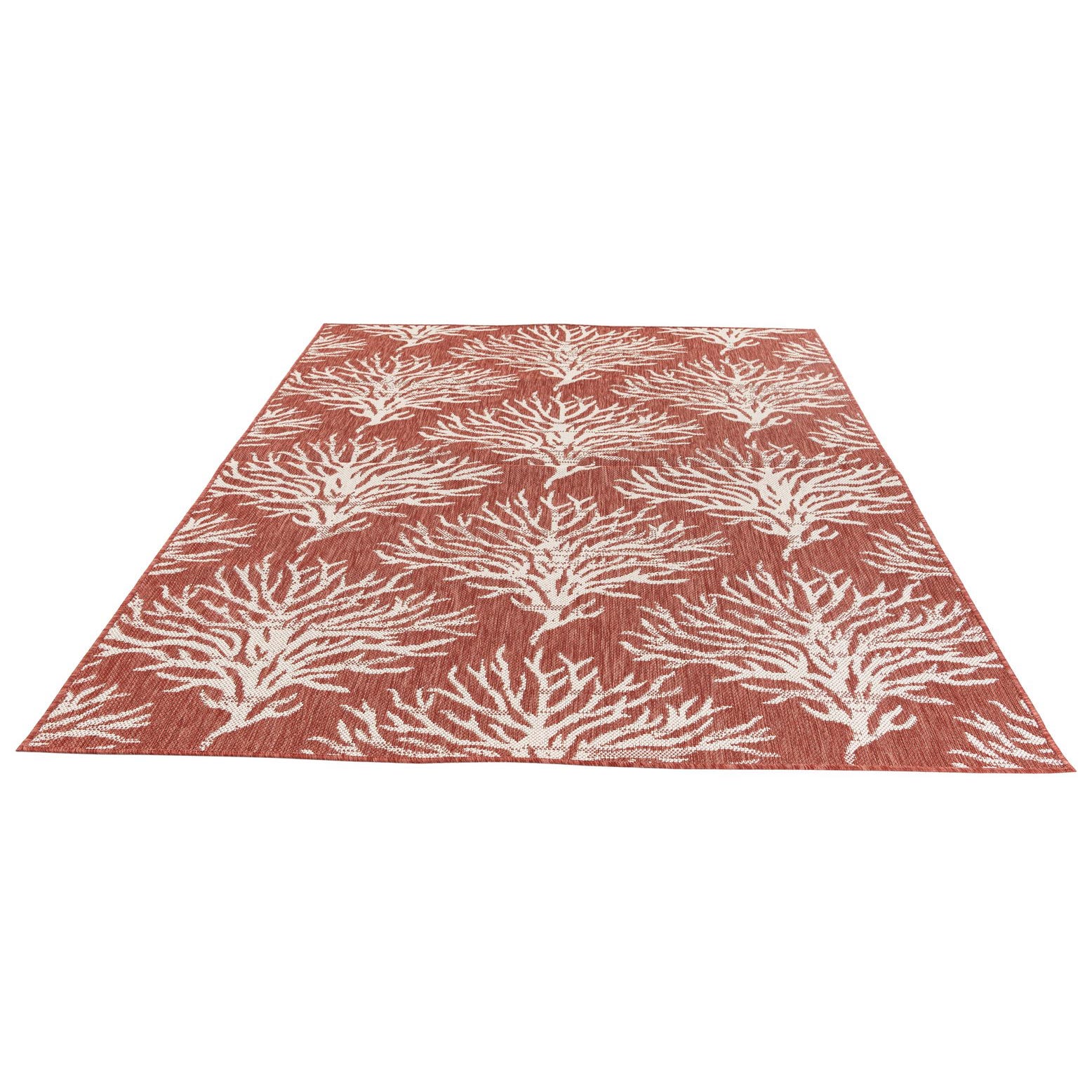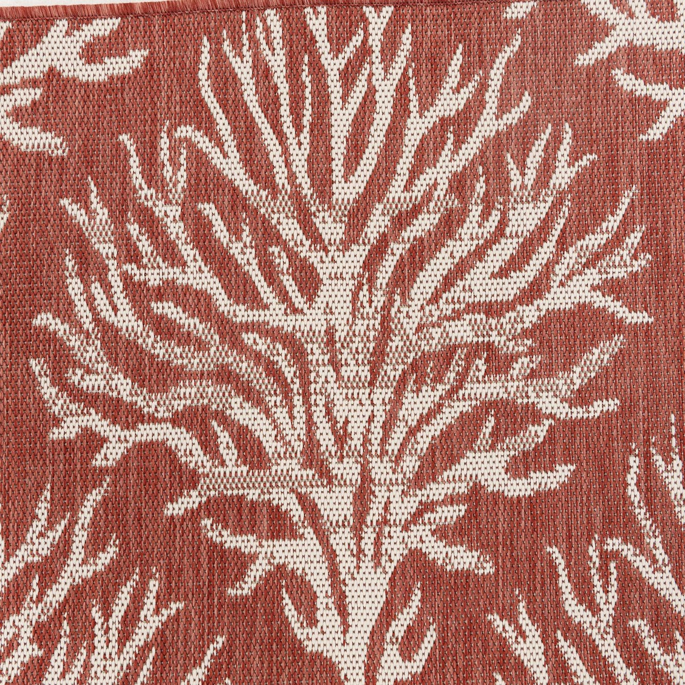 A 5x8 rectangular indoor/outdoor rug featuring a repeating white coral pattern on a textured red background, ideal for a patio or living room.
