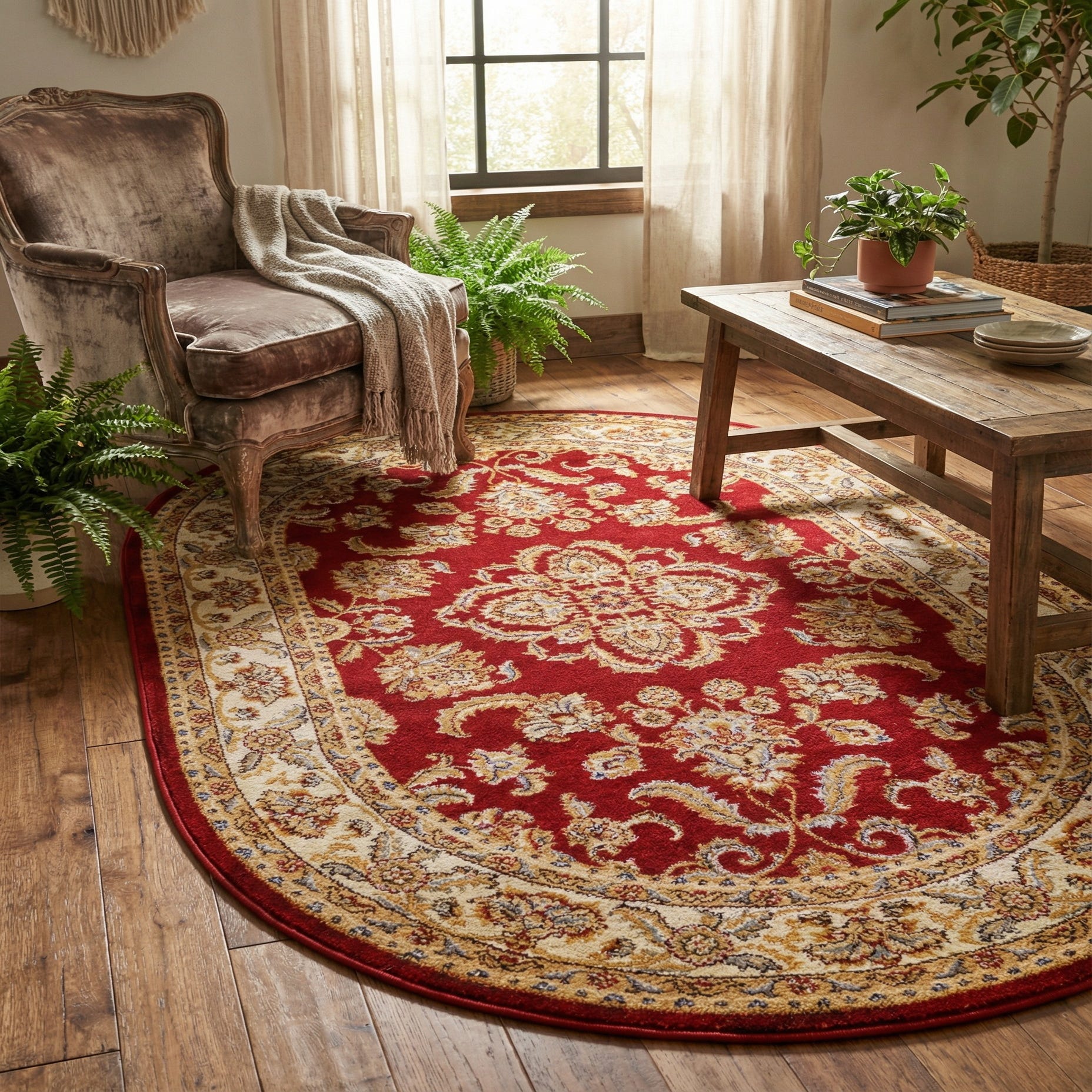 A rich red field sets the stage for a classic medallion and scrolling floral pattern that feels both formal and inviting. Cream and tan borders frame the central design, while accents of blue, brown, green and peach define the petals, vines and ornate flourishes. The oval silhouette emphasizes the central medallion and softens room lines, making the overall look balanced and finished.