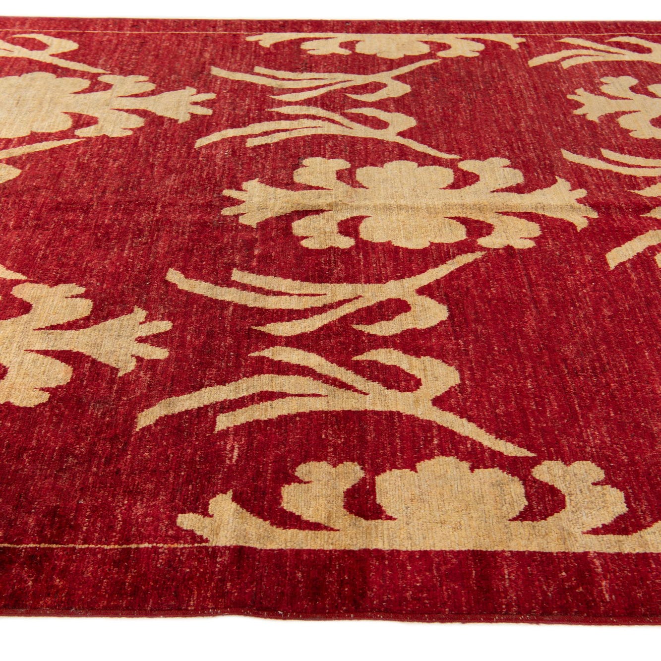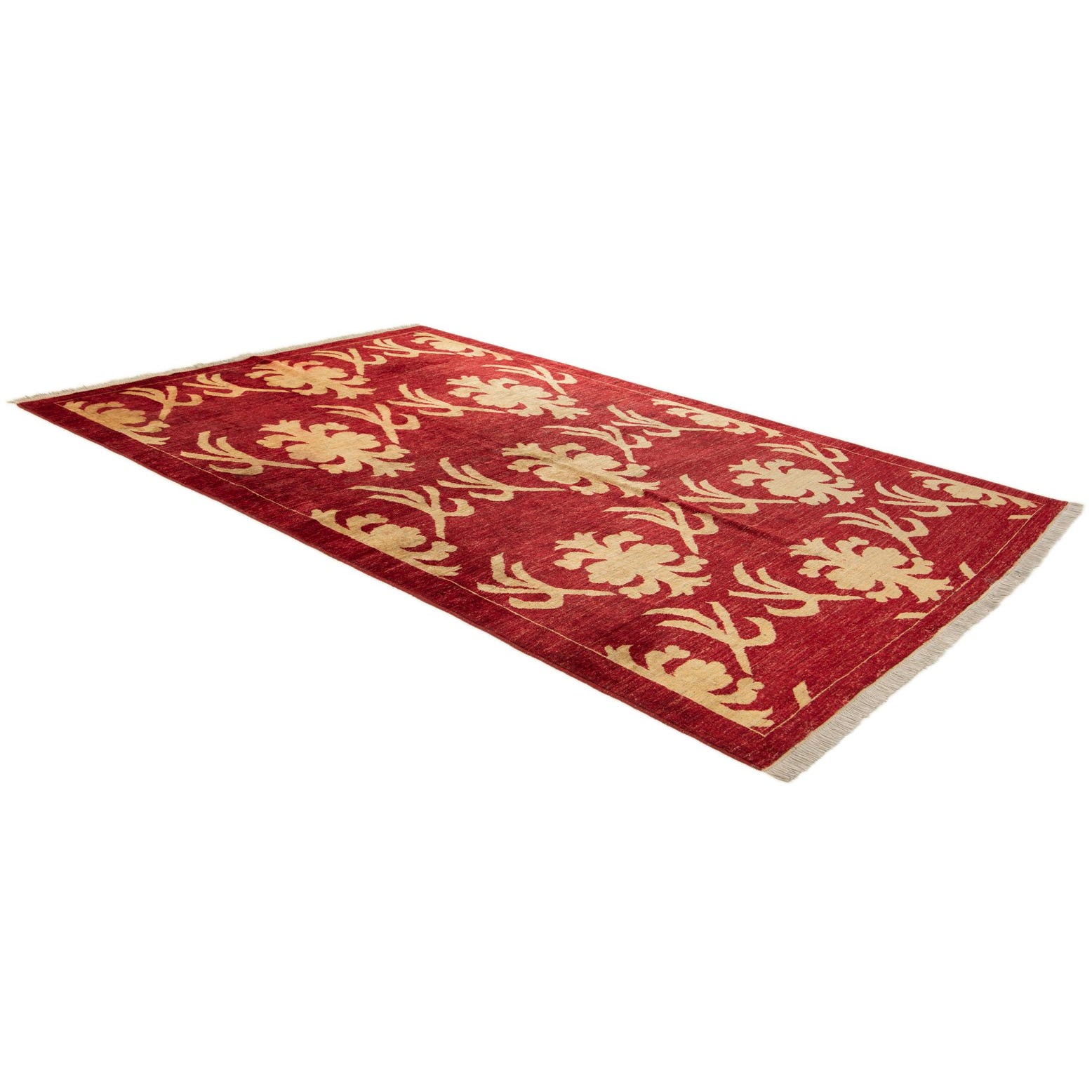 A 5x8 rectangular red Oriental rug with a repeating gold floral and vine pattern, handmade from wool.