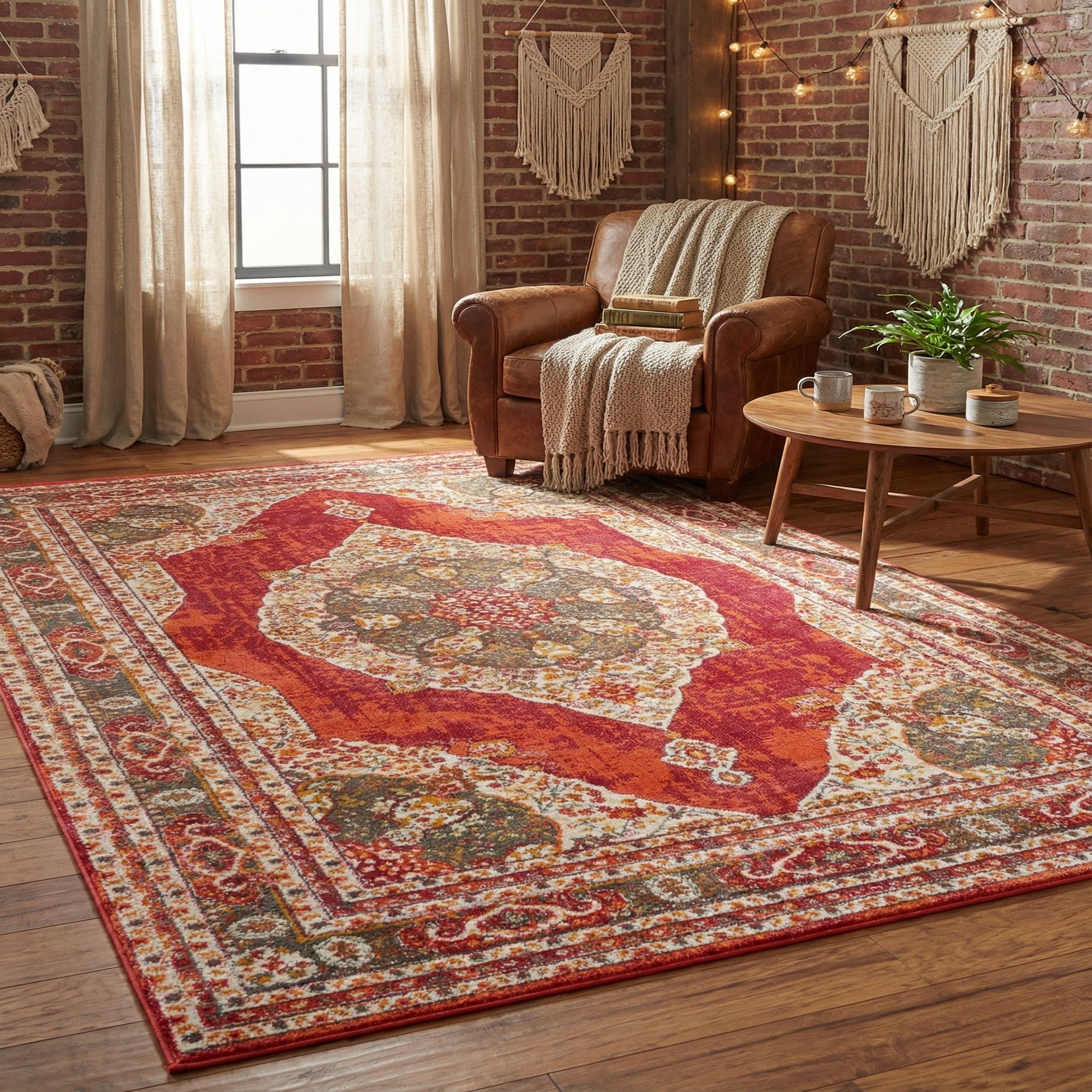 A bold central medallion and layered floral borders bring traditional Persian-inspired design into a lively color story. The background is a warm red, punctuated by ivory and terracotta motifs with olive and green accents and pops of orange that add depth and movement. The ornate border frames the field with repeating scrollwork and floral details, while a slightly distressed effect gives the pattern an intentional, lived-in character. Short fringe finishes the ends for a classic touch.