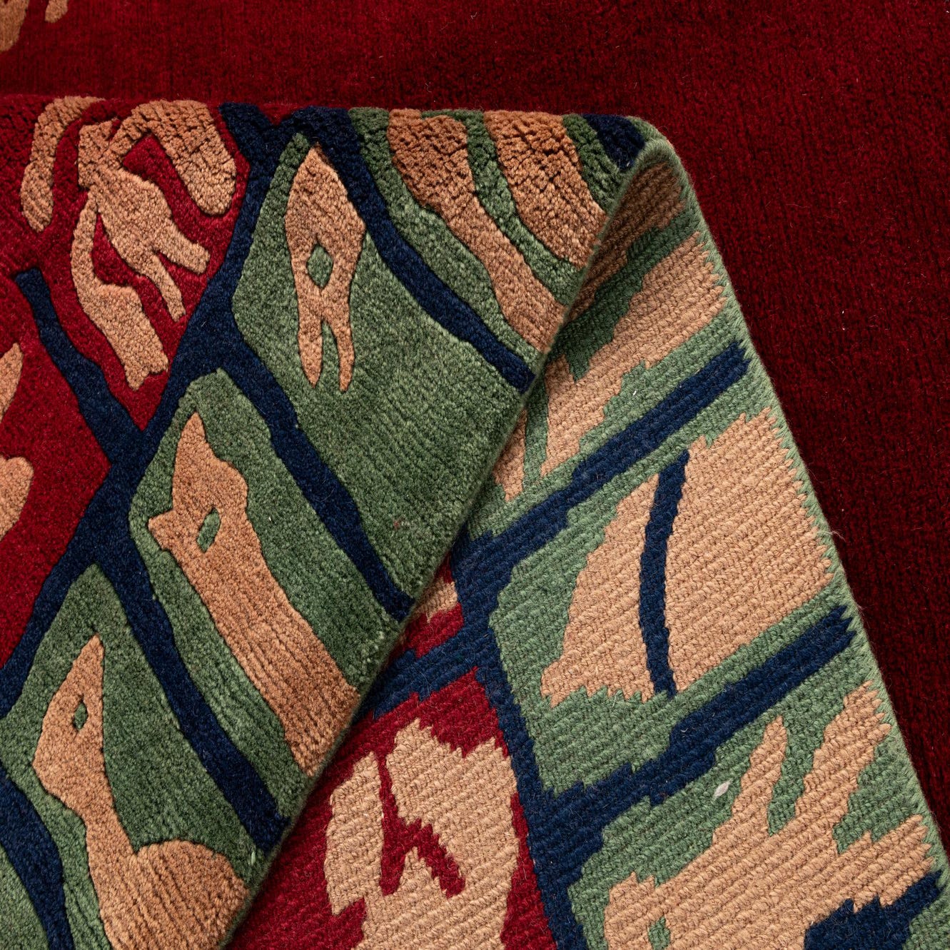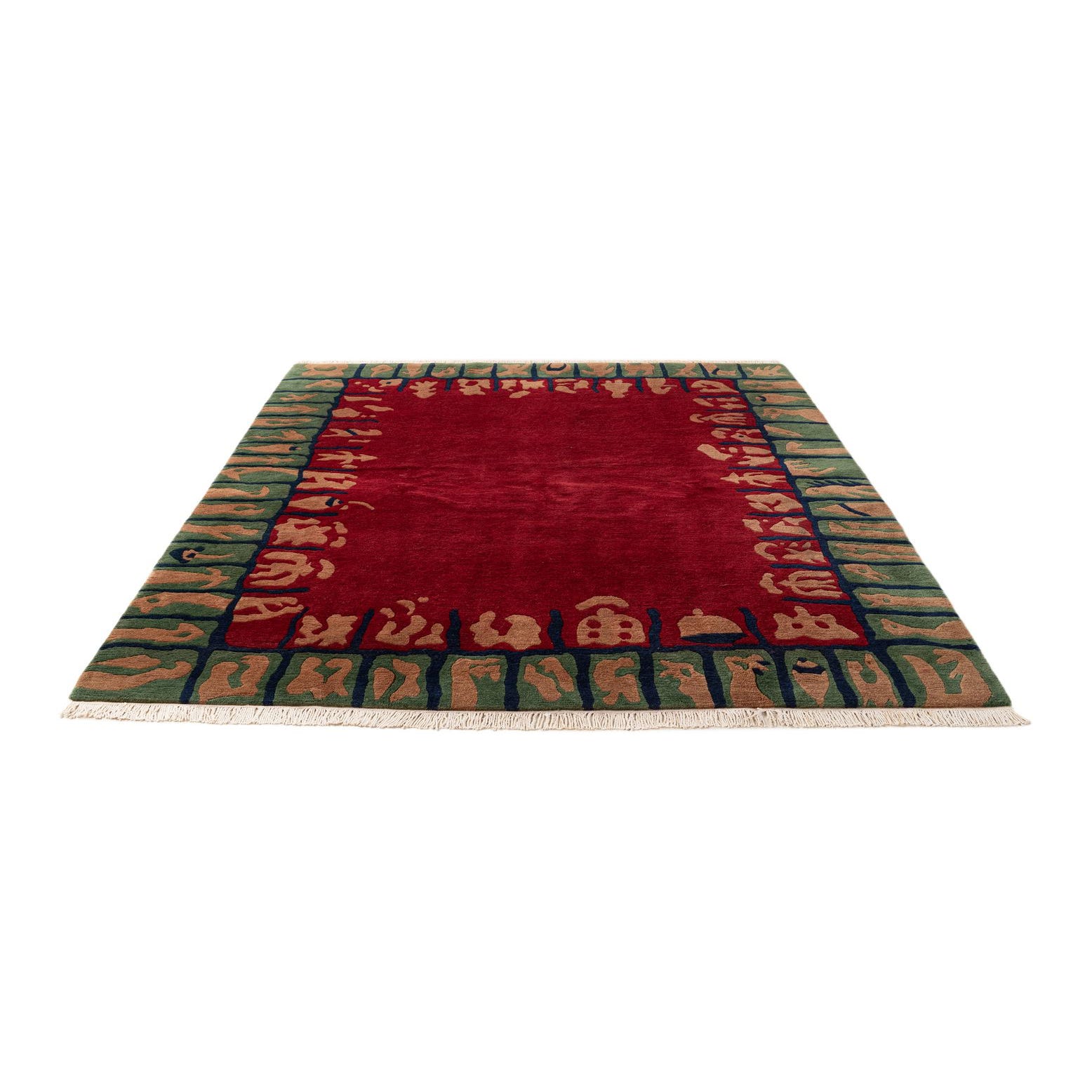 A 5x8 rectangular red wool rug with a modern abstract border in green, tan, and dark blue.