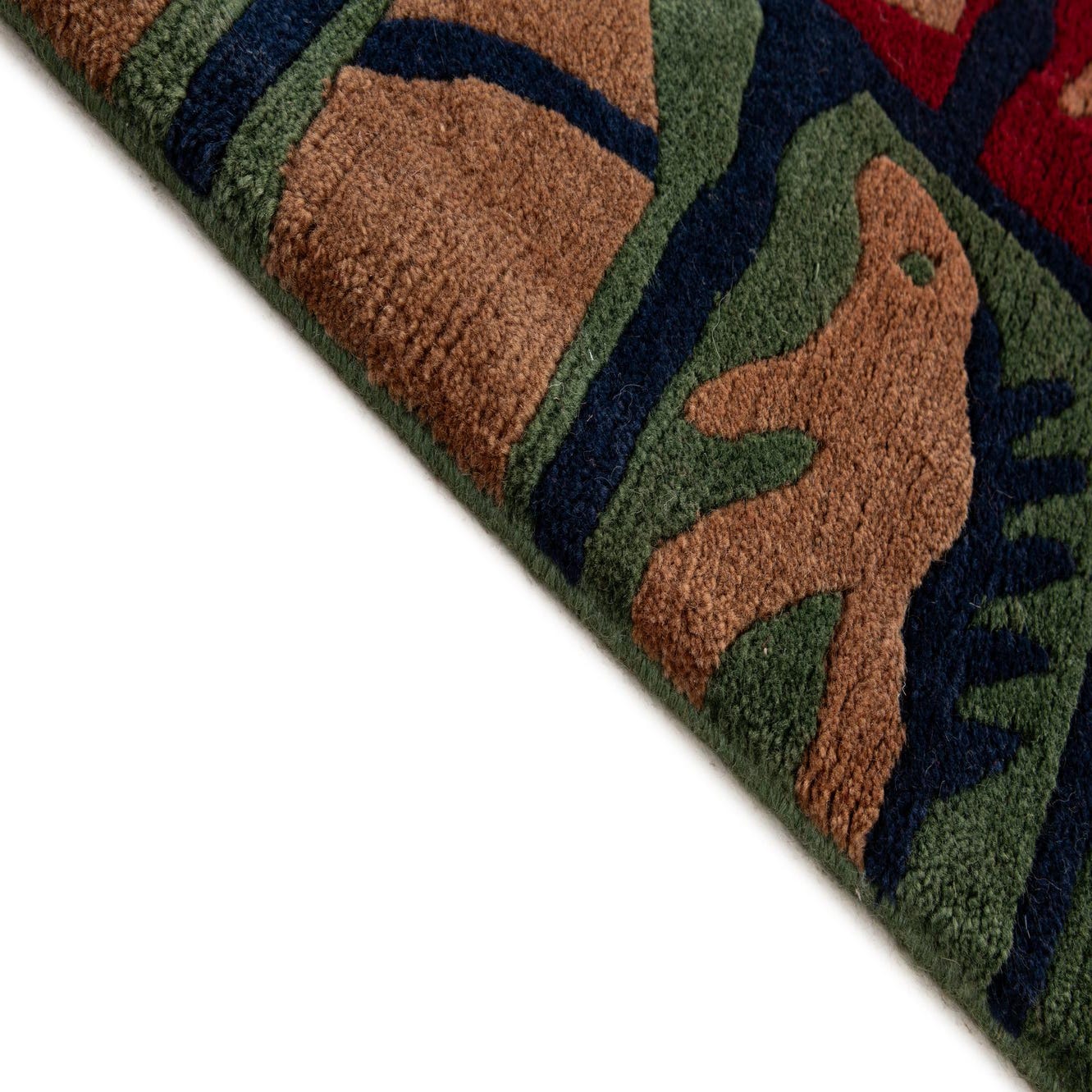 Primary color is Red. Colors in this rug include: Red, Green, Navy Blue, Brown.