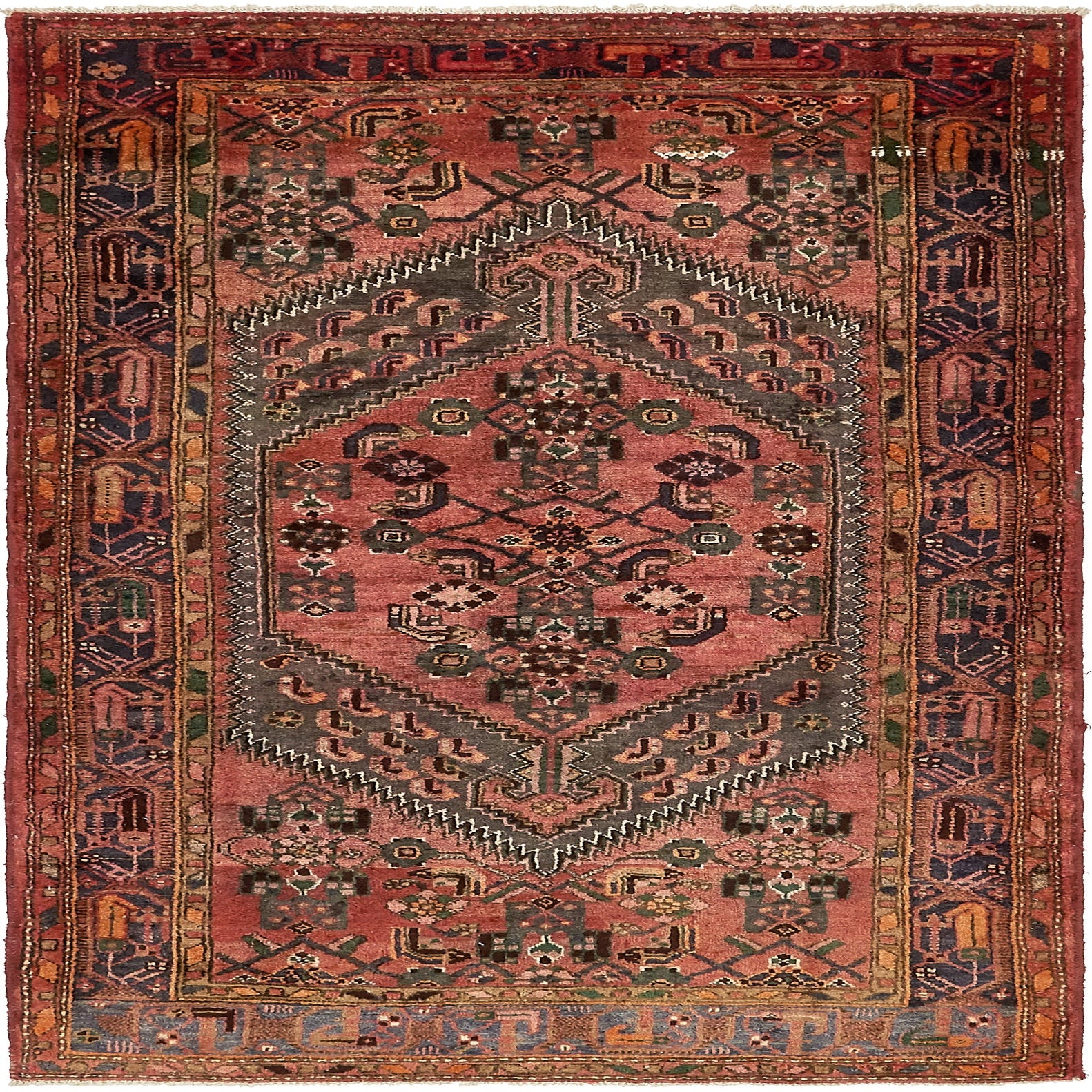 Primary color is Red. Colors in this rug include: Red, Navy Blue, Ivory, Blue, Green, Peach, Olive.