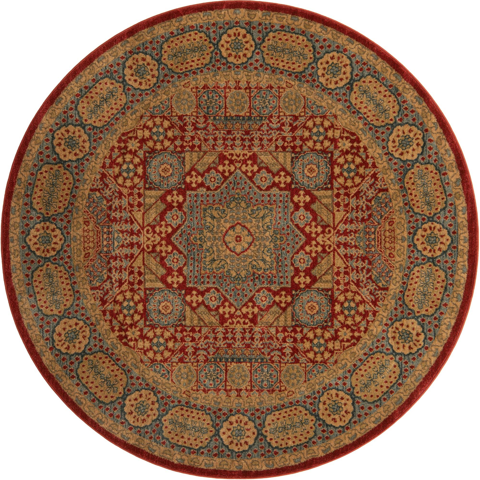 A round rug with a traditional medallion layout and layered borders, this piece puts a warm red field at the center of a densely patterned design. A star-like central medallion in light brown and blue sits amid geometric corner motifs and small floral rosettes, while the surrounding guard borders alternate oval and circular motifs in tan and light blue accented with olive and light green sprigs. Machine made from 100% polypropylene, the surface has a low, even pile that feels smooth and slightly springy underfoot, letting the fine pattern read clearly without a high nap.