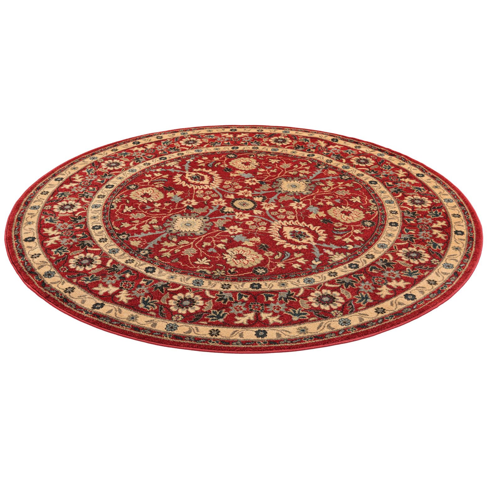 The Chelsea Collection offers a 6 Ft Round rug, machine-woven of 100% polypropylene, ensuring durability and ease of maintenance. This piece presents a rich palette, with a red background complemented by accents in beige, blue, brown, green, light blue, olive, and light green. The traditional pattern, featuring a dense array of floral motifs and intricate borders, creates an ornate aesthetic perfect for adding warmth and visual interest to a space.