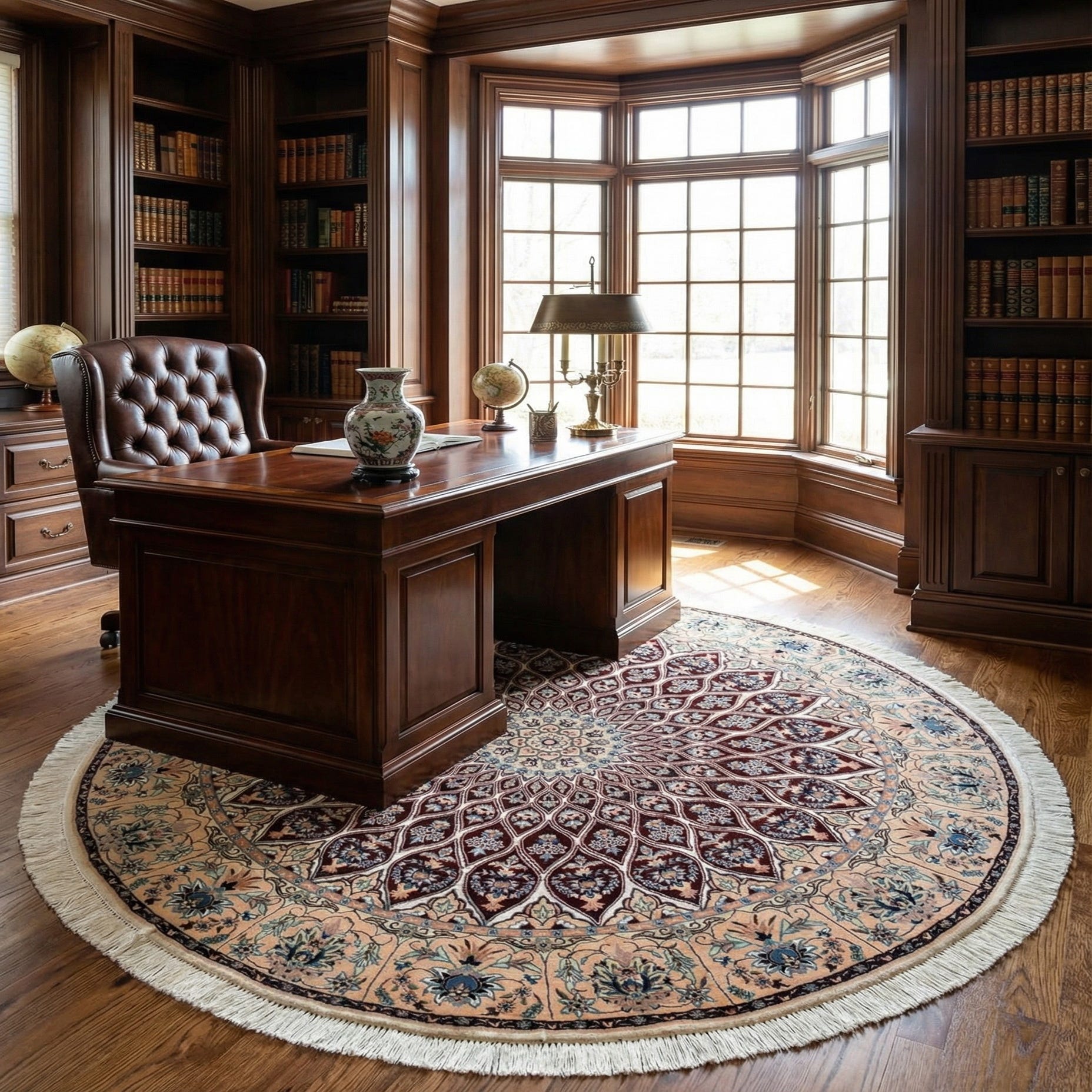 This rug would be a fitting centerpiece in a variety of interior spaces, from more traditional settings that honor the historic roots of its design to modern spaces where it could serve as a statement piece. It could be paired with polished wood furniture, employed to add warmth to minimalist decor, or serve as an anchor in a library or study with rich wooden bookcases and leather seating. Its round shape makes it particularly well-suited for placement beneath circular tables or in foyers where it can warmly welcome guests with its intricate pattern and lush texture.