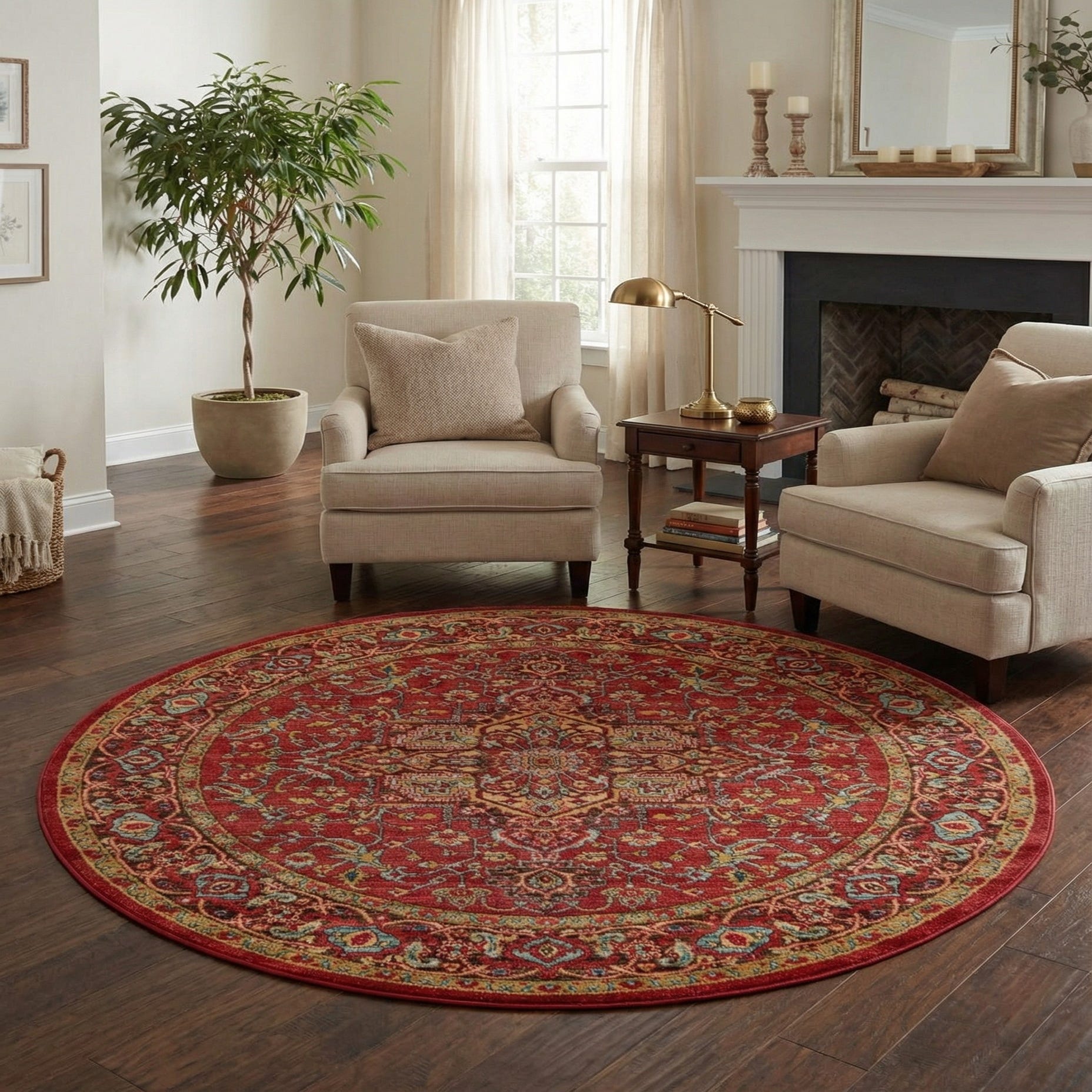 This rug's bold color palette and round shape would complement interiors that favor traditional furnishings or a classic aesthetic, but it can also serve as a striking contrast in more contemporary or minimalist settings. It would be particularly well-suited beneath a round dining table or as a focal point in a seating area. The vibrant red can be used to draw out accent colors in a room or to introduce a splash of energy into a neutral environment.