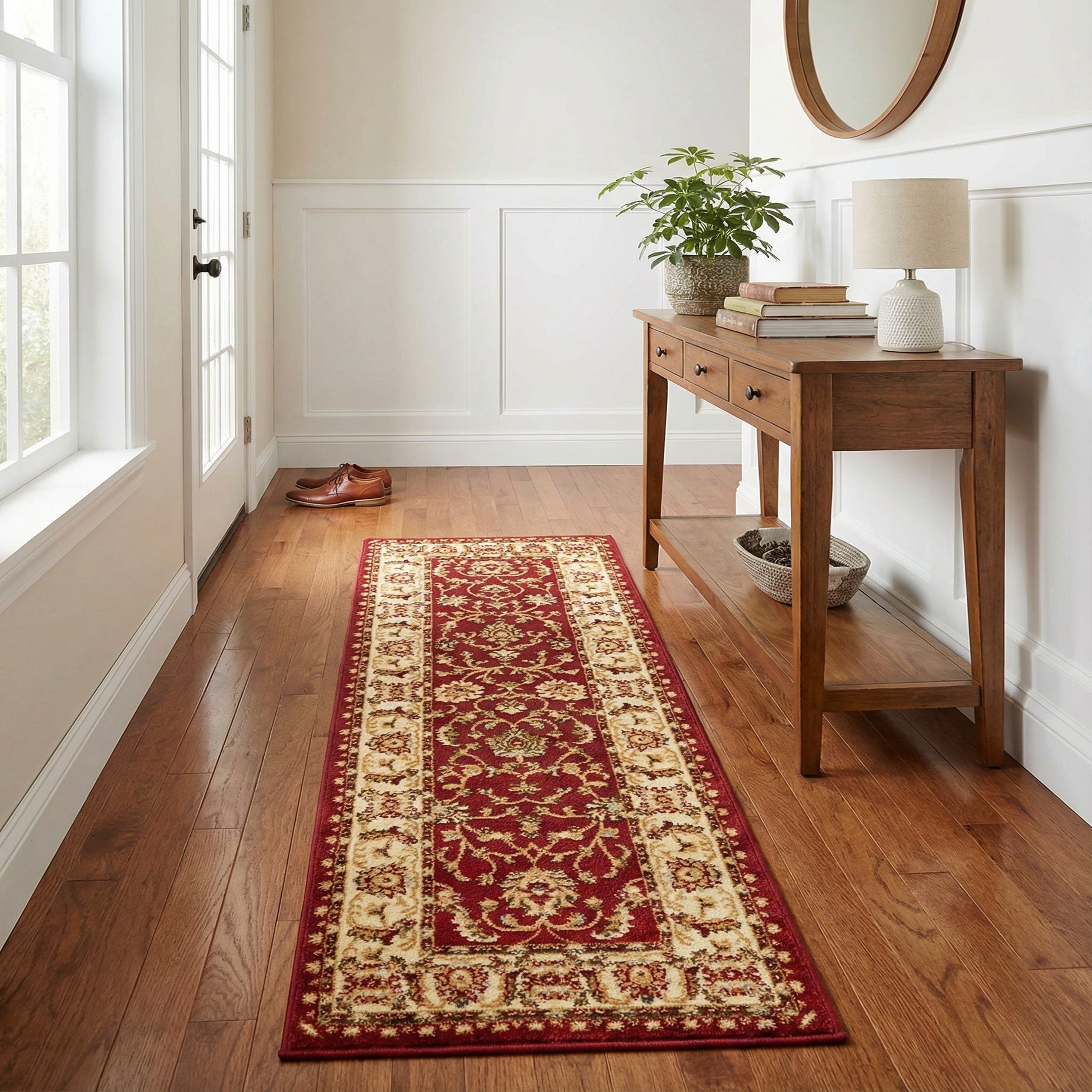 Machine-made from 100% polypropylene, this runner offers durable construction and an approachable texture that works well in everyday spaces. Place it in a hallway or entry to add color and structure, lay it along a kitchen galley or narrow corridor to guide traffic, or use it to anchor seating in a long living area. It pairs naturally with warm wood tones, leather or upholstered furnishings, and both traditional and transitional interiors where a touch of classic pattern and color is desired.