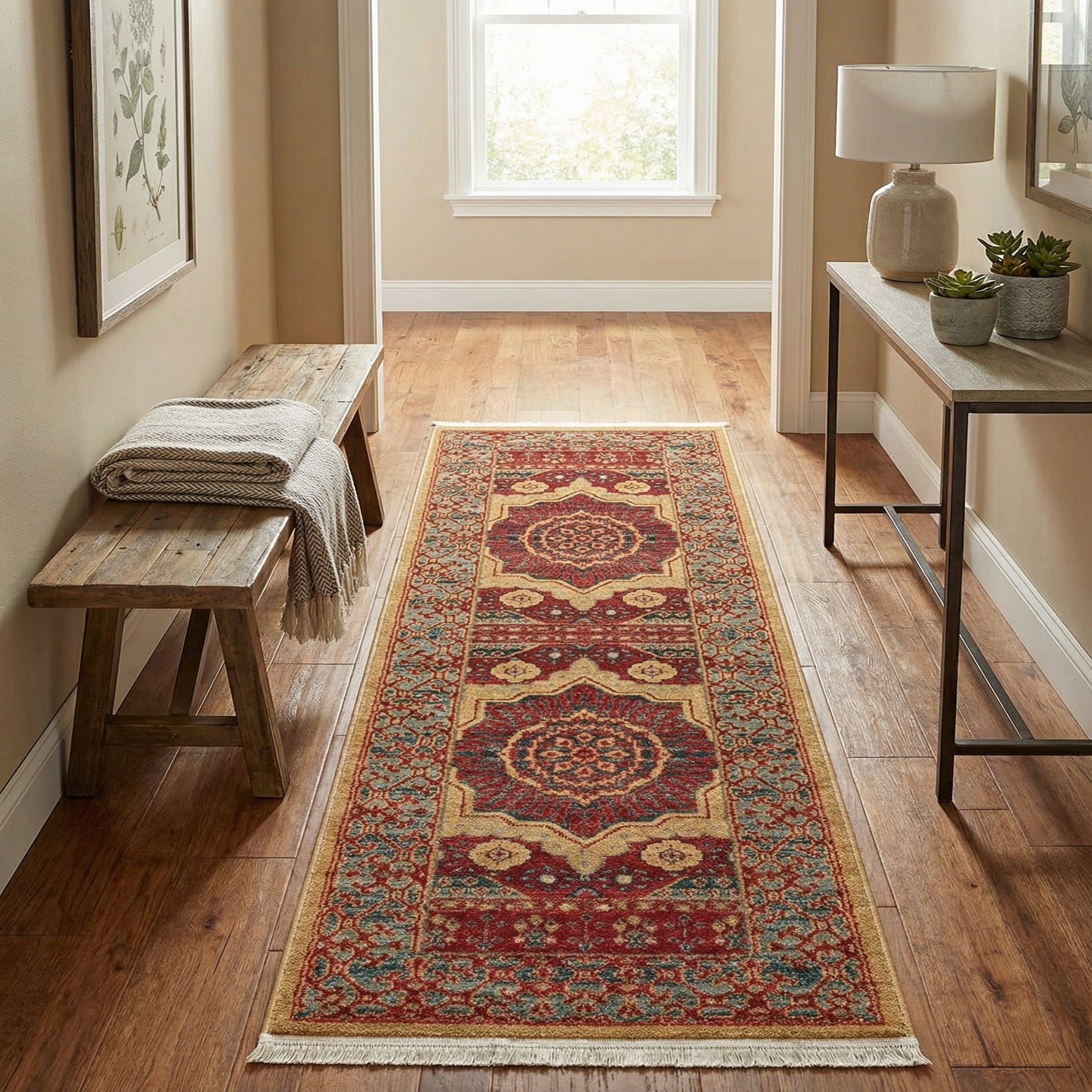 Place this runner in a hallway or entry to add color and pattern, or use it to define a galley kitchen or narrow corridor. It pairs nicely with warm wood floors, painted cabinetry, or neutral upholstery; combine it with navy or cream textiles to pick up the accent tones, or layer it into a traditional living space with carved wood furniture and brass details. The classic motif also works in transitional interiors where historic patterning meets more contemporary furnishings.