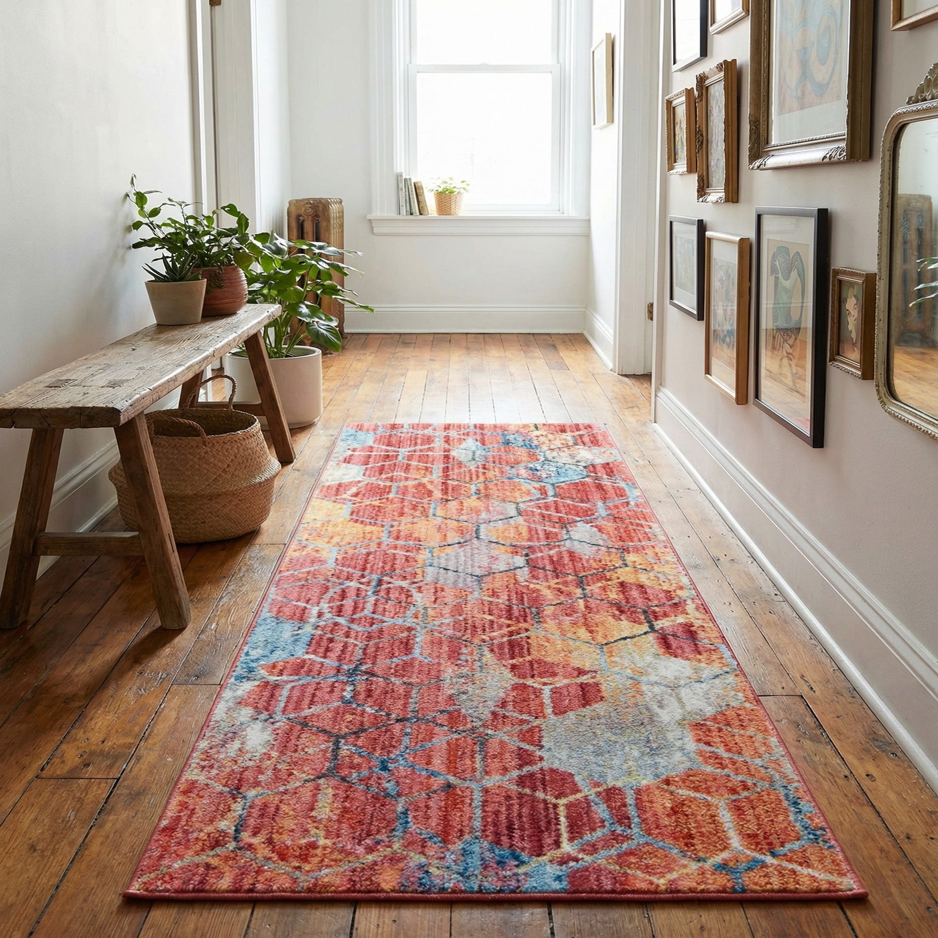 Machine made from 100% polyester (space-dyed yarn), the pile feels soft underfoot with a smooth, slightly plush hand that also shows the yarn’s tonal depth. As a runner, it brings color and rhythm to hallways, entryways or alongside a bed; it pairs especially well with warm wood floors, neutral upholstery, brass or gold accents, and navy or beige textiles. Use it to add a lively, modern touch to eclectic, transitional or mid-century inspired rooms.