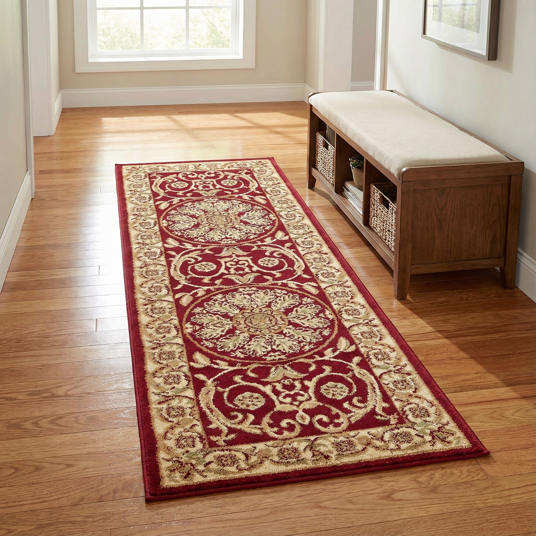 A traditional runner with repeating medallion motifs and scrolling arabesques, this rug pairs a rich red field with cream and tan ornamentation and subtle touches of light green and light blue. Large circular floral medallions sit along the center, framed by an ornate cream border of rosettes and vines that creates a formal, structured layout. The machine-made construction in 100% polypropylene produces a low- to medium-profile pile with a soft hand and a gentle sheen that lifts the pattern and adds tactile contrast between the background and raised motif.