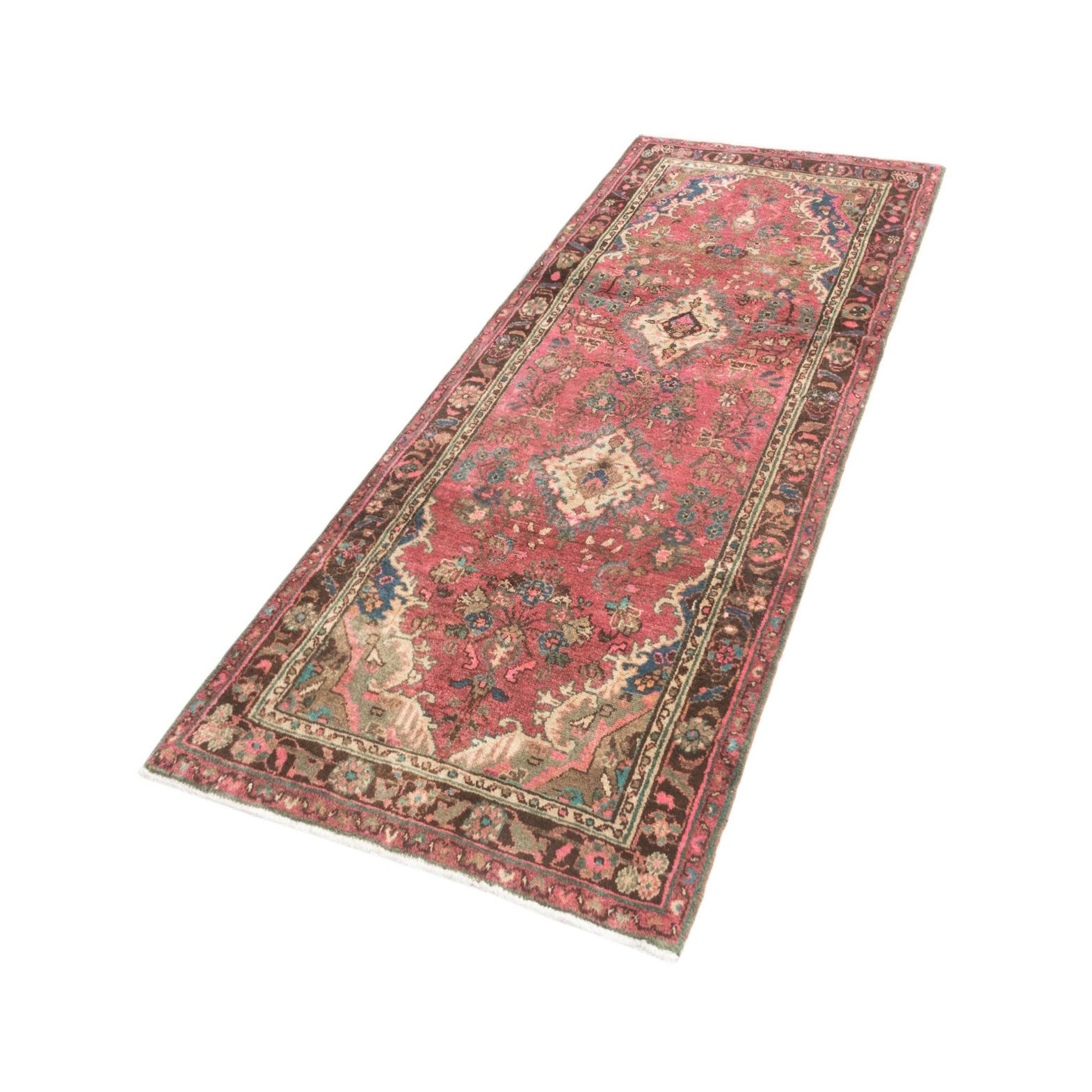 The rug's design, featuring central medallions and a detailed border, exudes a classic style that is well-suited for settings that embrace traditional or eclectic themes. This runner is versatile and could be perfectly positioned in a hallway, entryway, or alongside a kitchen island, where it would add color, warmth, and a sense of history to the space. Its dimensions make it ideal for narrow, elongated spaces, providing a visual anchor and an element of interest in a variety of interior designs.