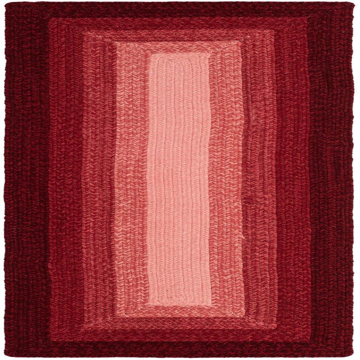 A 6 ft runner rug with a braided texture, featuring a modern design with shades of red, from light to dark, in a rectangular pattern.