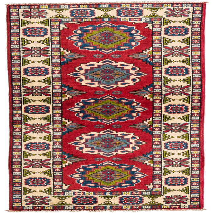 A rich red background anchors a bold row of geometric medallions in layered tones of light blue, navy, green, cream and brown, each framed by a cream outer border punctuated with floral rosettes and small-scale motifs. The pattern draws on traditional Caucasian design language—stepped diamonds, scalloped edges and precise linear accents—rendered with clear color contrast that gives each motif crisp definition. Hand-knotted from 100% hand-spun wool, the surface has a firm, substantial hand with a soft tactile nap that adds depth to the colors and a comfortable feel underfoot.