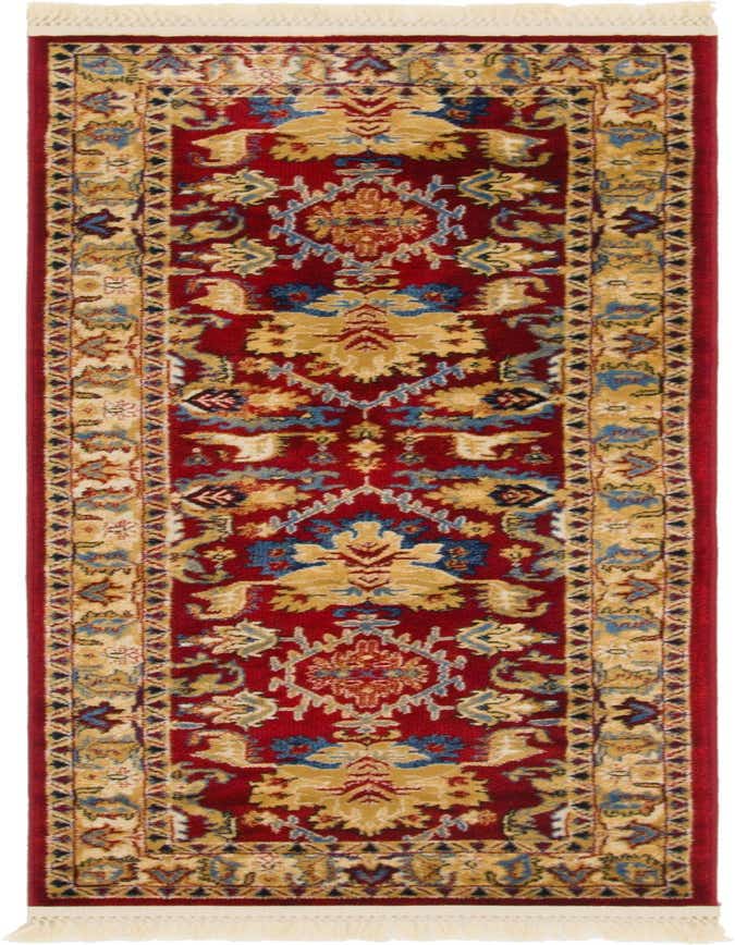 Primary color is Red. Colors in this rug include: Red, Beige, Black, Blue, Ivory.