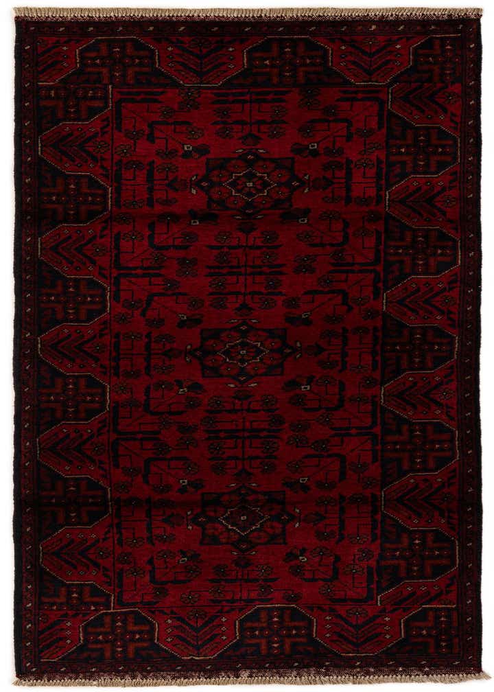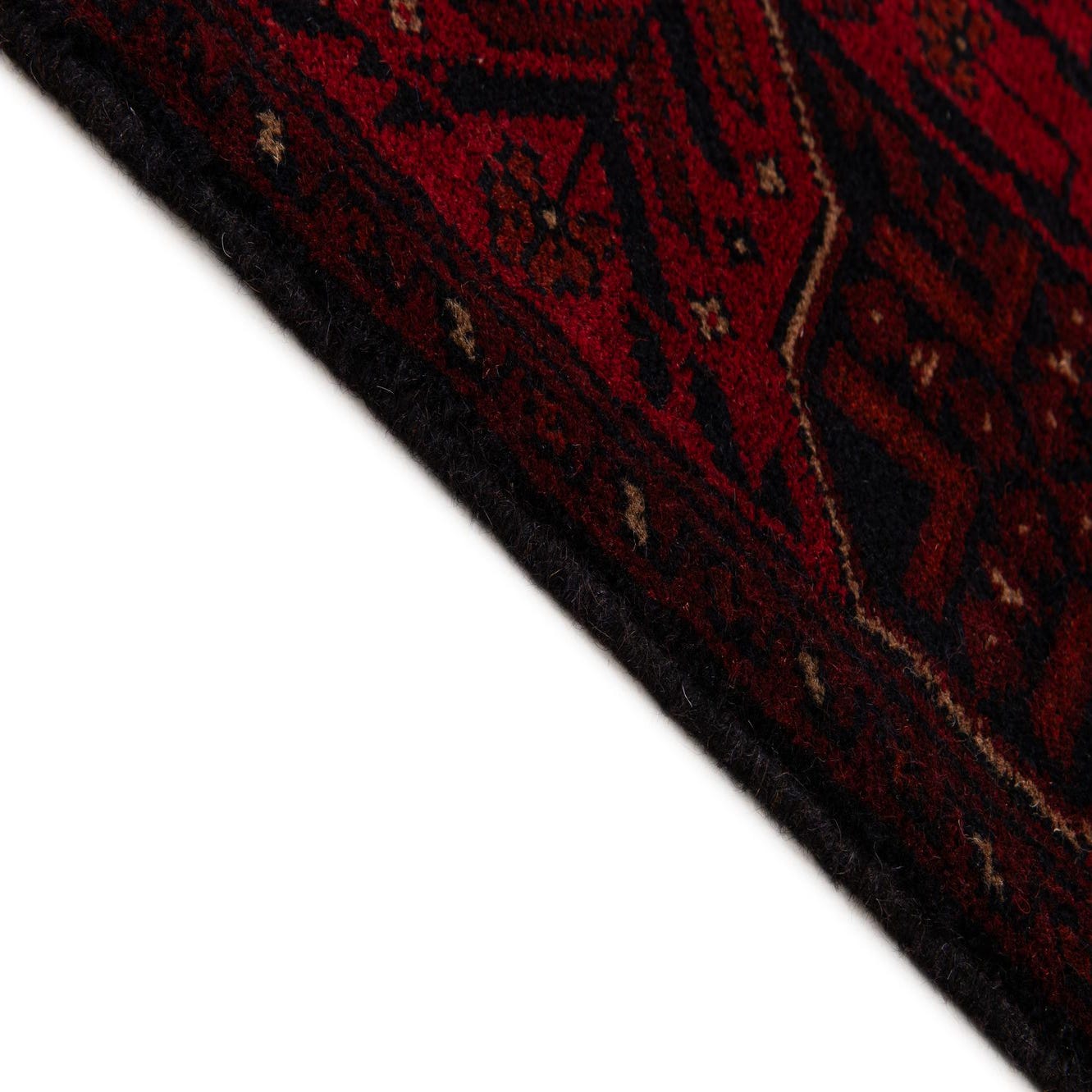 A 6 ft Khal Mohammadi runner rug in deep red with intricate dark blue and black oriental patterns, suitable for a hallway.