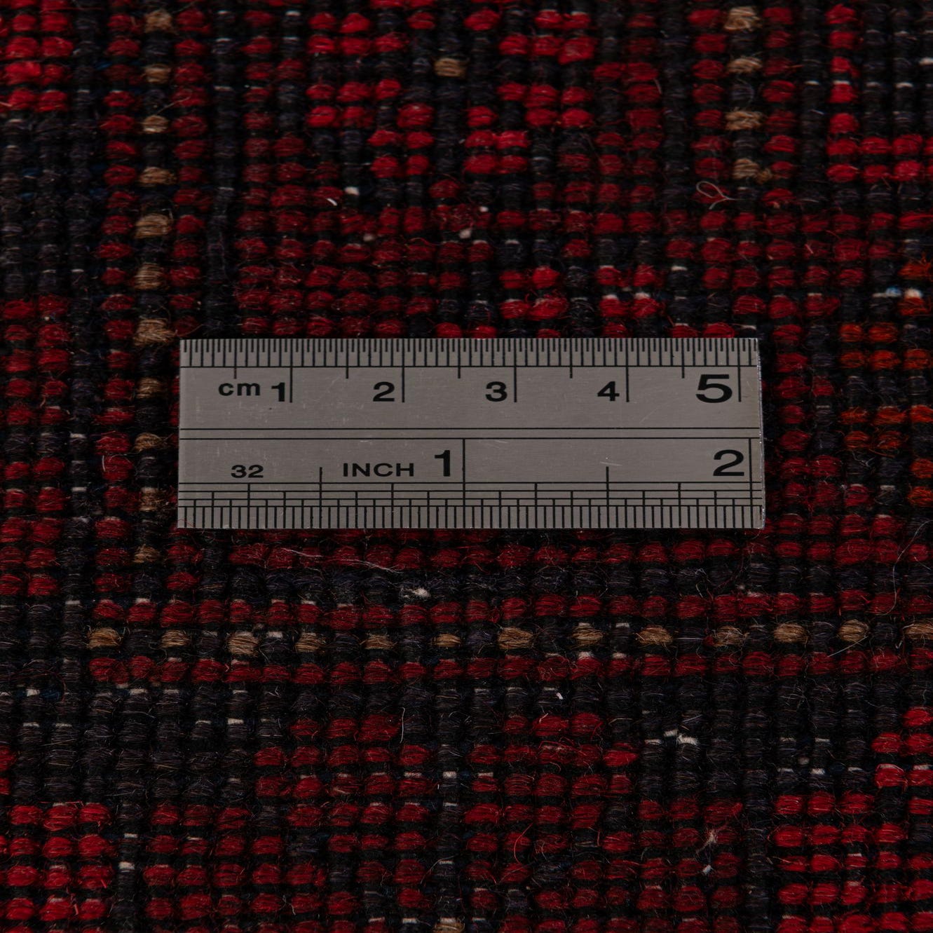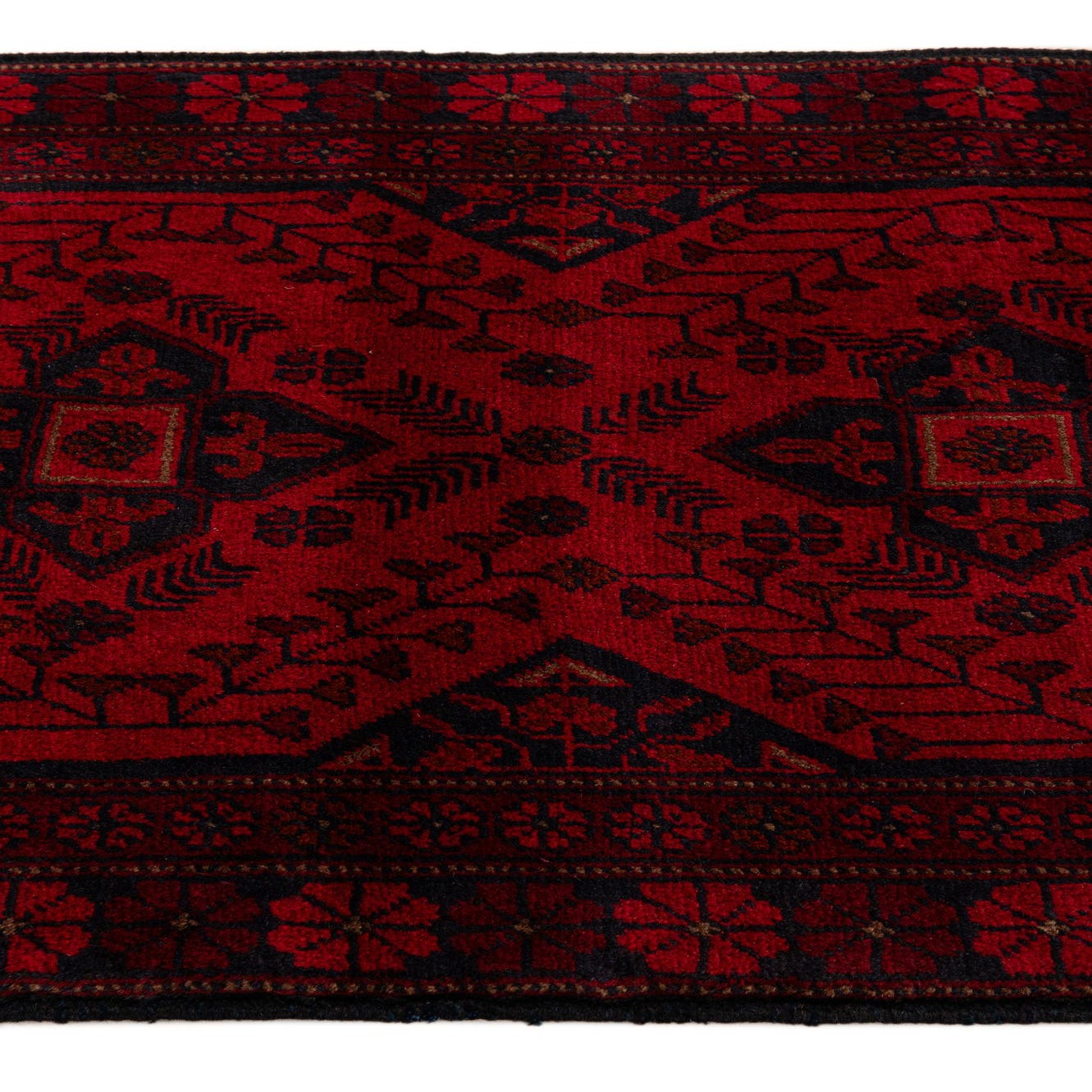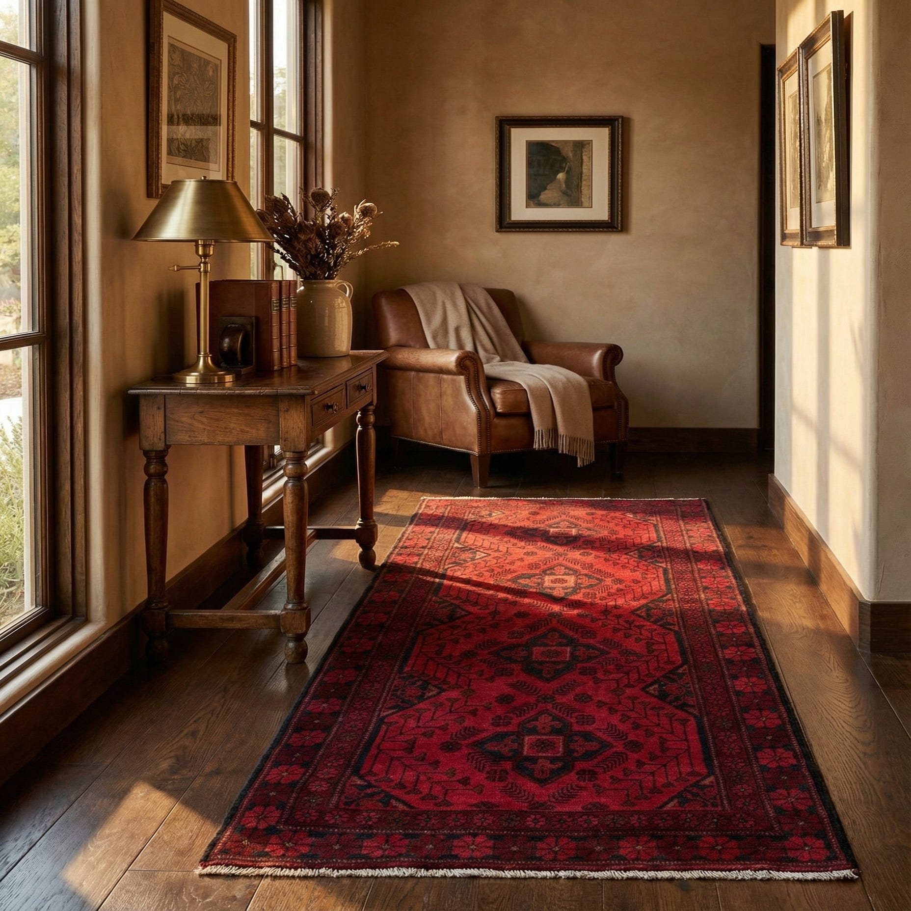A 6 ft runner rug in deep red with intricate dark blue and black oriental patterns, perfect for a hallway.