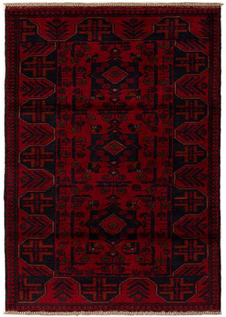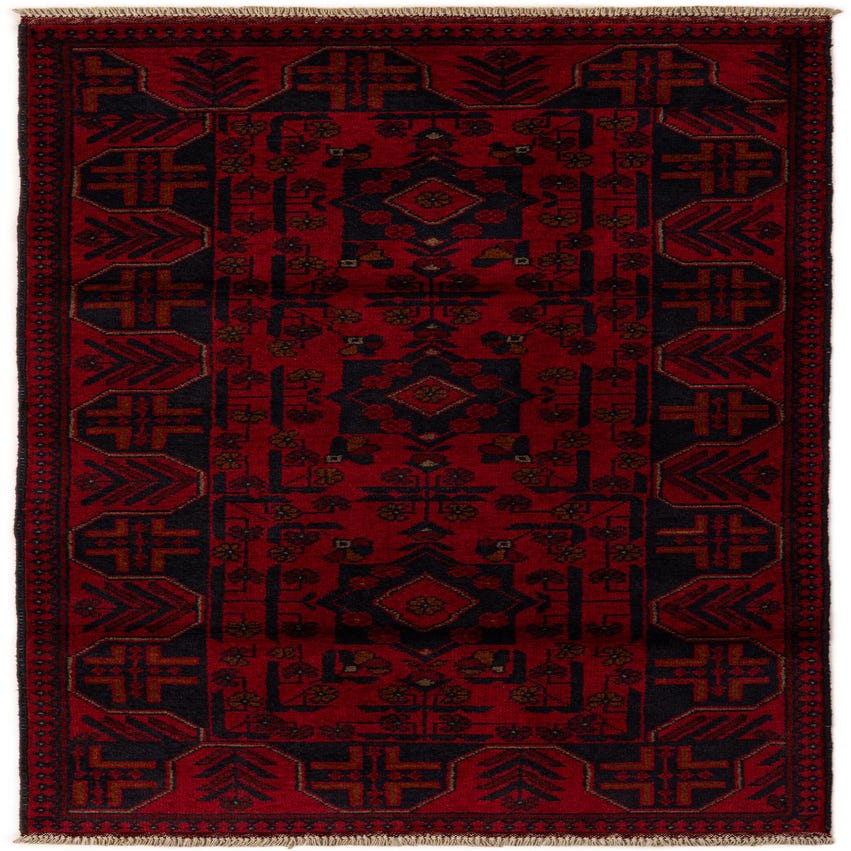 Primary color is Red. Colors in this rug include: Red, Brown, Navy Blue.