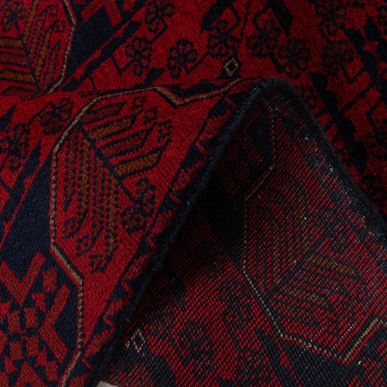A 6 ft Khal Mohammadi runner rug in deep red and navy blue with intricate Oriental patterns, handmade from wool.