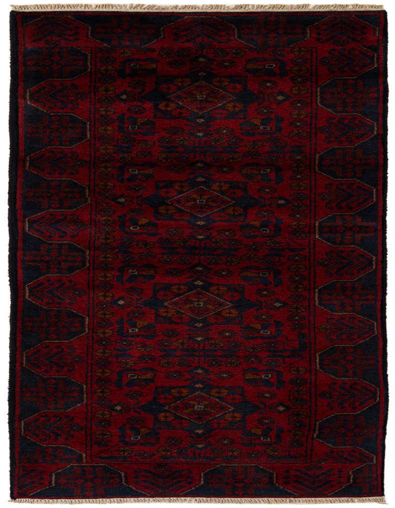 Primary color is Red. Colors in this rug include: Red, Brown, Navy Blue.