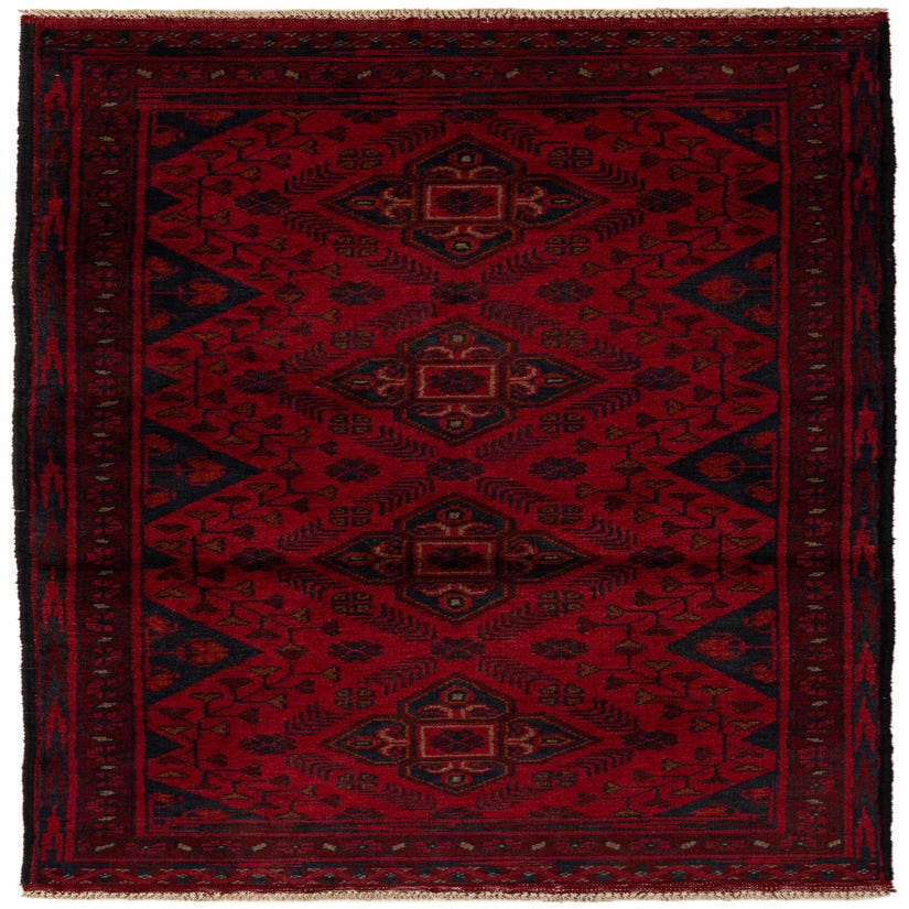 Primary color is Red. Colors in this rug include: Red, Brown, Navy Blue.