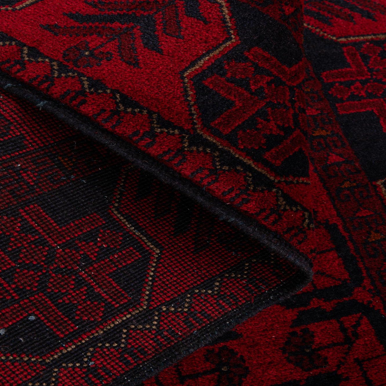 A 6 ft Khal Mohammadi runner rug in deep red with intricate black and dark red oriental patterns, suitable for a hallway or kitchen.