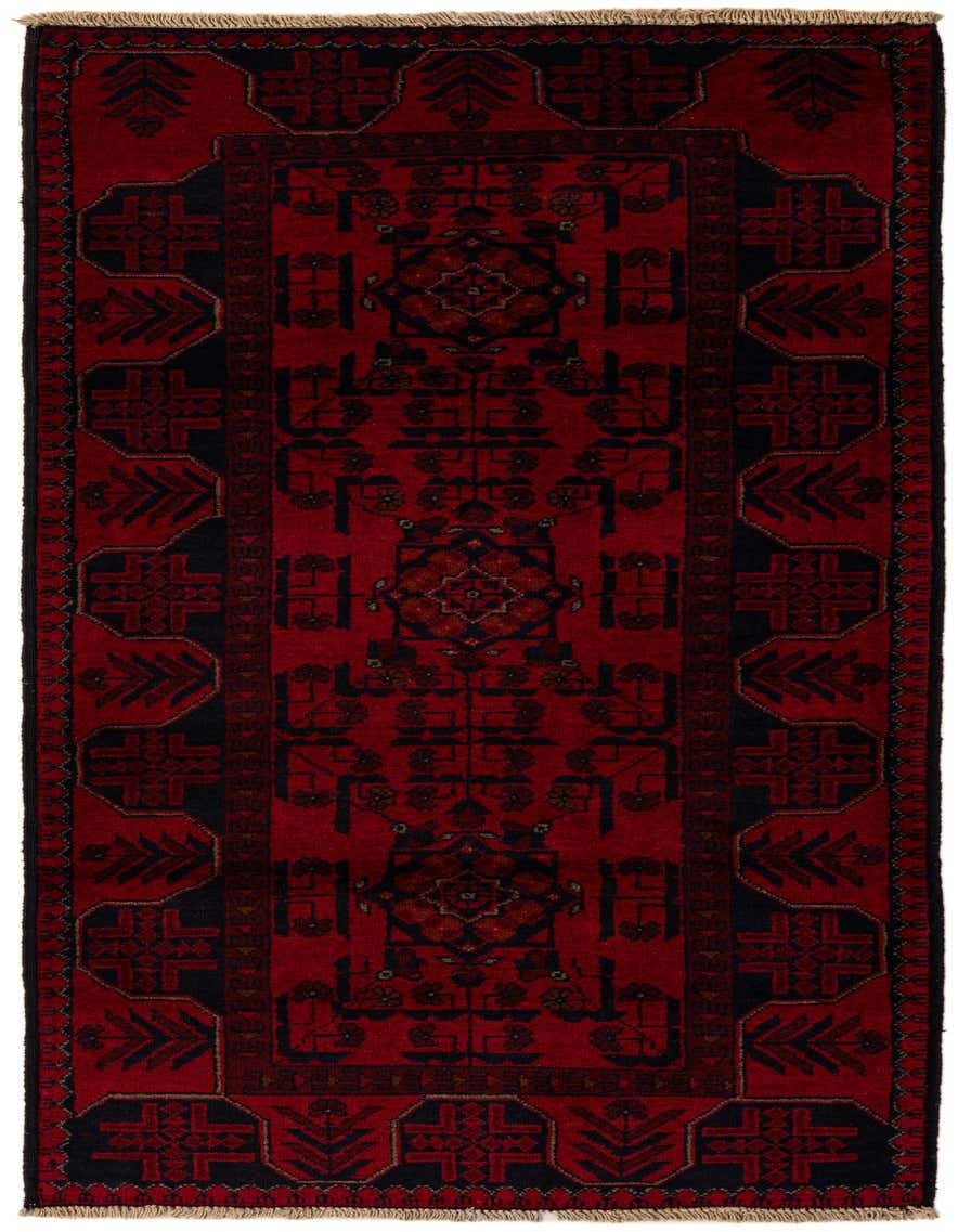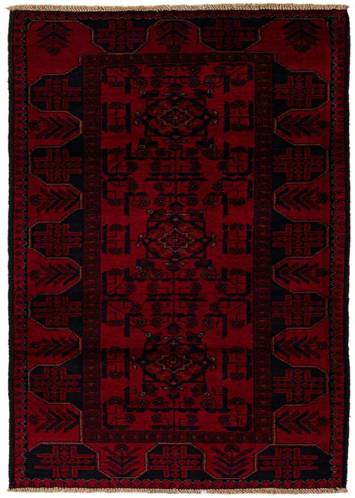 Primary color is Red. Colors in this rug include: Red, Brown, Navy Blue.