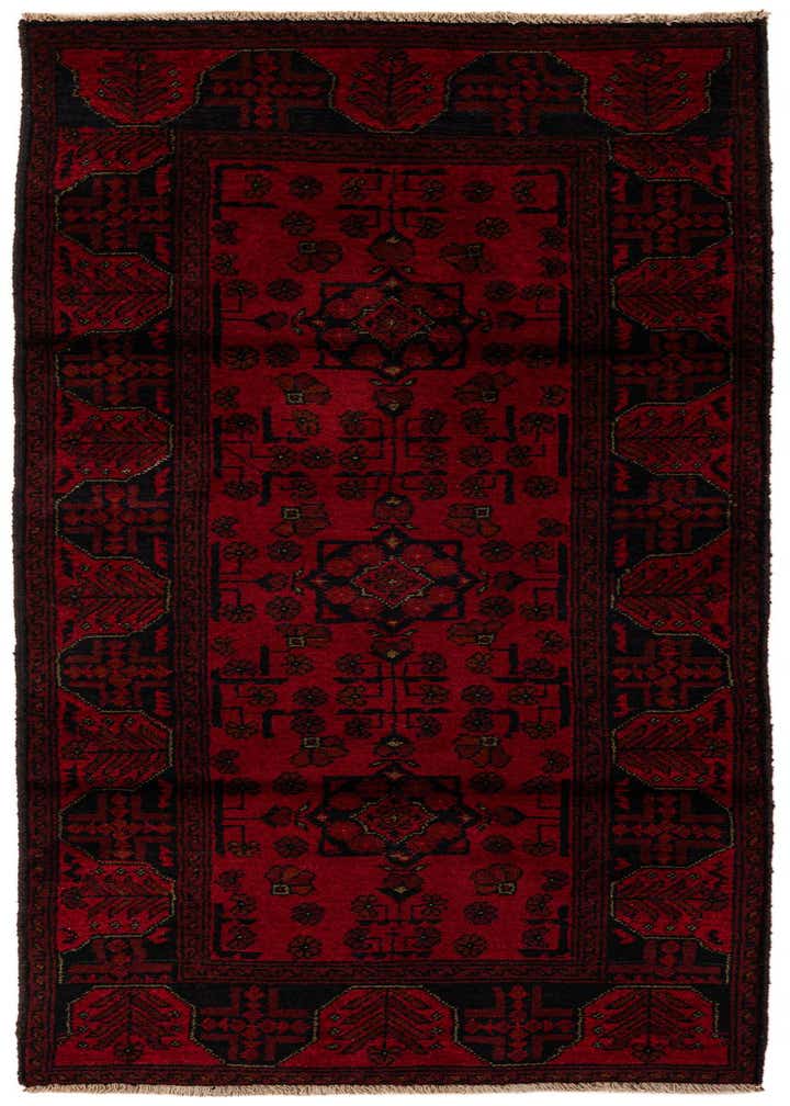 Primary color is Red. Colors in this rug include: Red, Brown, Navy Blue.