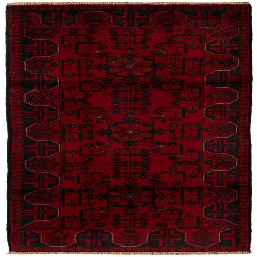 Primary color is Red. Colors in this rug include: Red, Brown, Navy Blue.