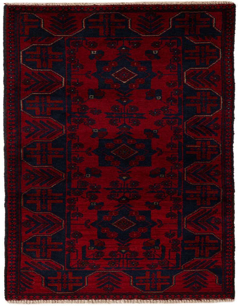 Primary color is Red. Colors in this rug include: Red, Brown, Navy Blue.