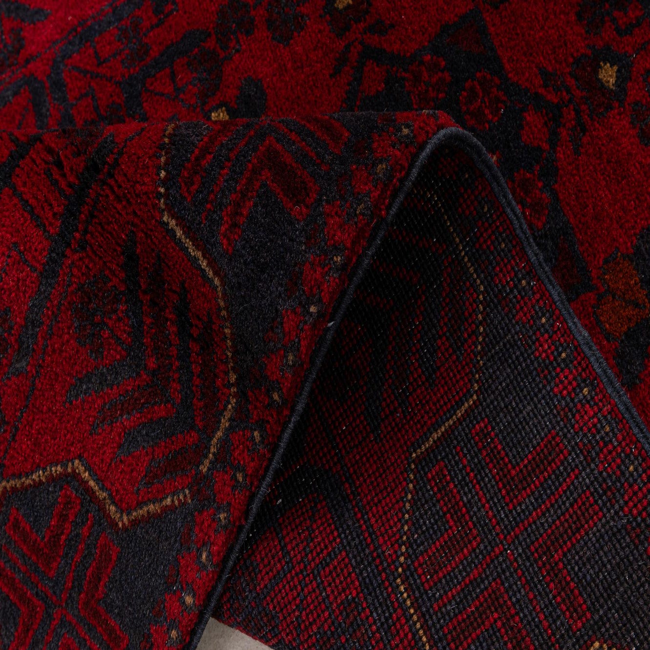 A 6 ft Khal Mohammadi runner rug in deep red with intricate dark blue and brown Oriental patterns, ideal for a hallway.