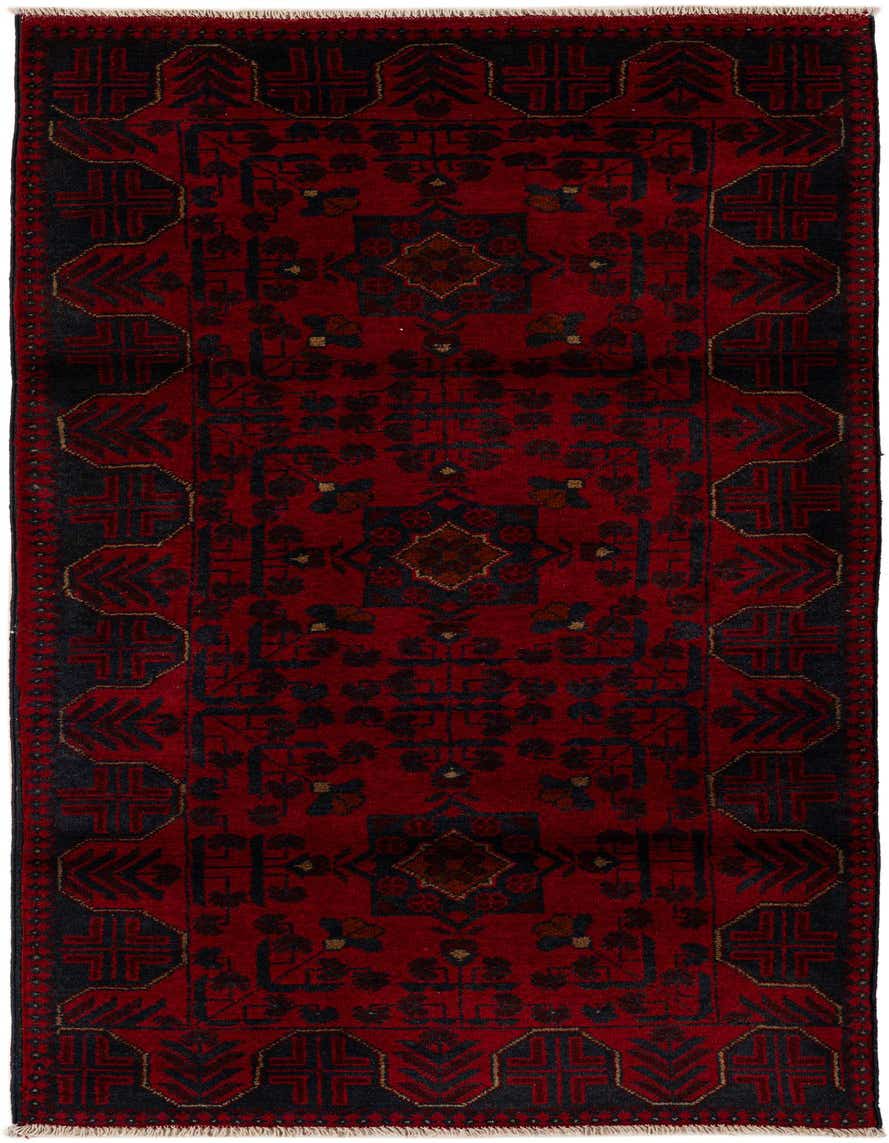 Primary color is Red. Colors in this rug include: Red, Brown, Navy Blue.
