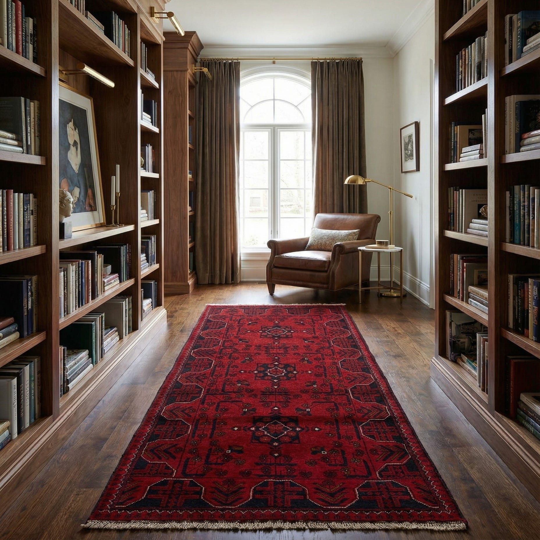 A 6 ft Khal Mohammadi runner rug in deep red with intricate dark blue and black oriental patterns, featuring a medium pile and fringed ends.