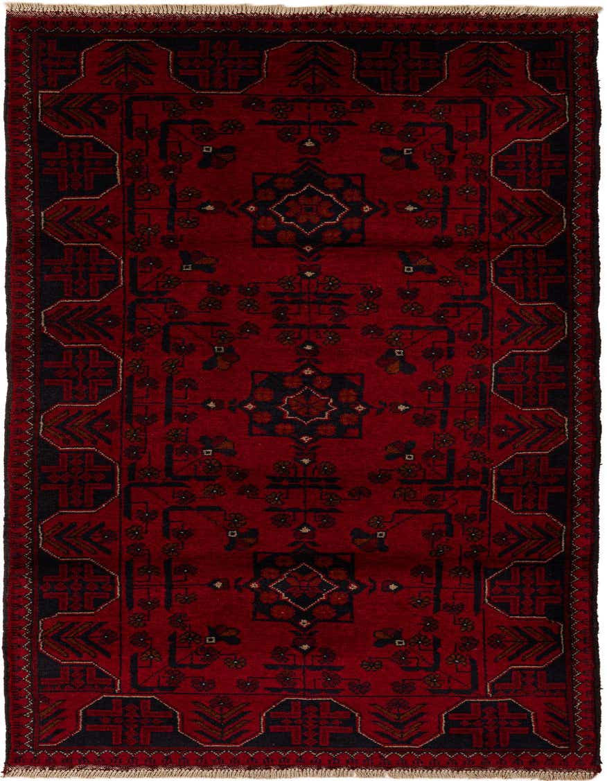 Primary color is Red. Colors in this rug include: Red, Brown, Navy Blue.
