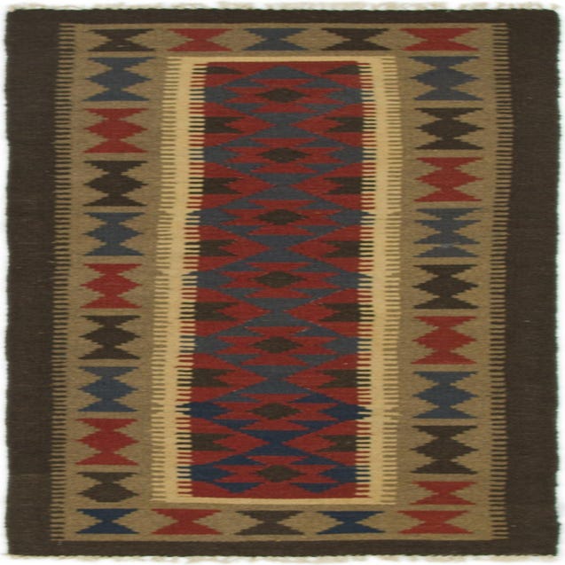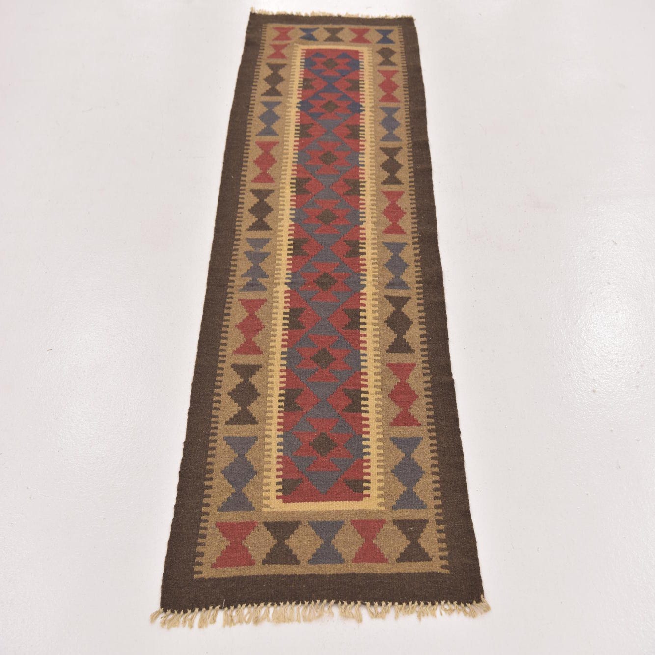 A 6 ft runner rug with a Southwestern tribal pattern in reds, blues, and browns, featuring a flatweave texture.