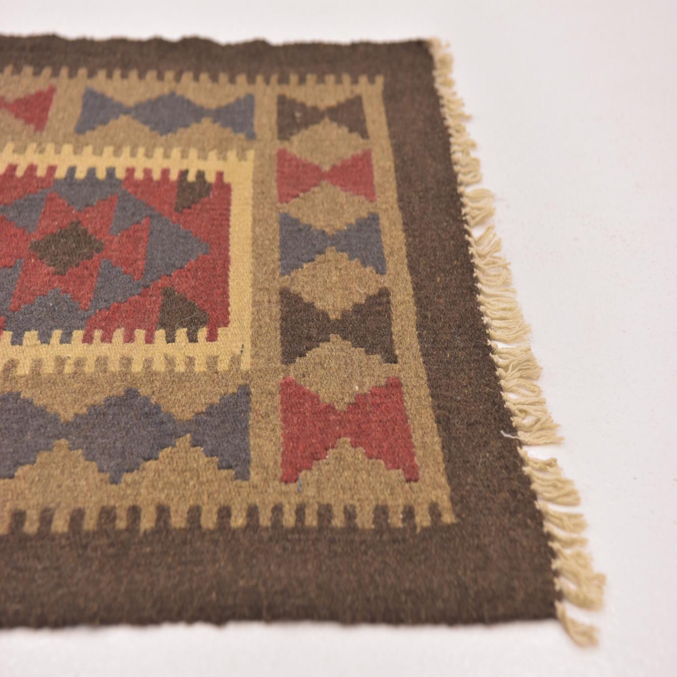 The Kilim Maymana is a hand-woven 6 ft runner crafted from 100% wool, showcasing a robust texture and durable construction suitable for high-traffic areas. Its pattern features a compelling combination of geometric motifs, rendered in a palette of red, beige, brown, ivory, and navy blue. The background color prominently displayed is red, enhancing the warmth and inviting nature of the piece. This runner is defined by a fringe finish that adds a traditional touch to its appearance.