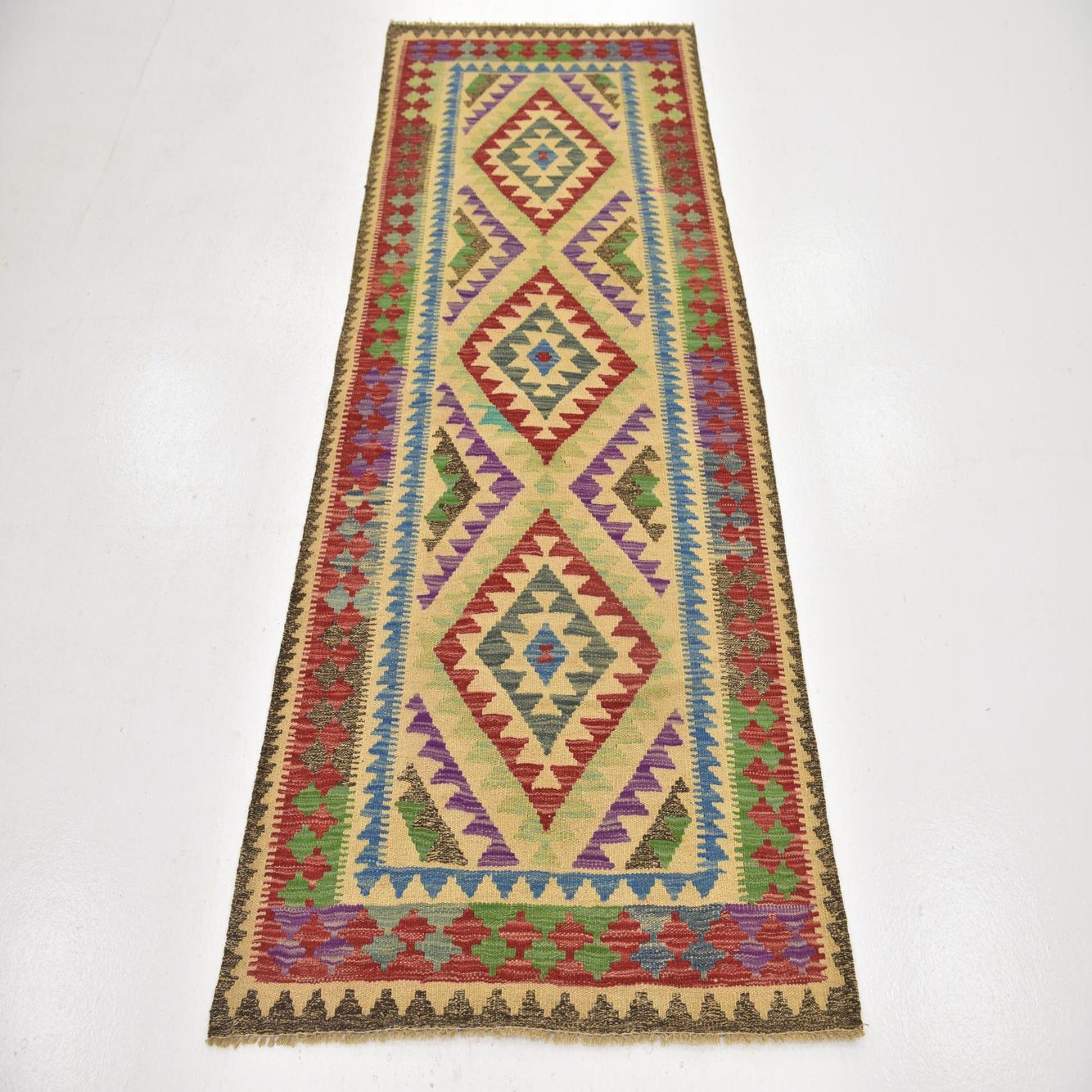 A 6 ft runner rug featuring a vibrant tribal pattern with red, blue, green, and purple diamonds on a cream background.