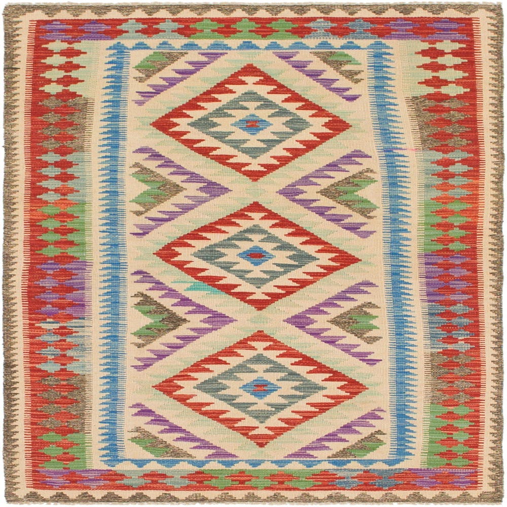 Primary color is Red. Colors in this rug include: Red, Blue, Cream, Green, Olive, Gold, Violet, Brown.
