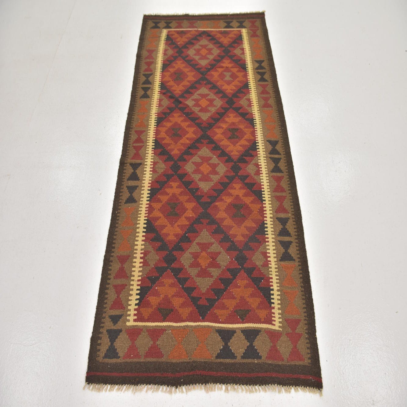 Its rich color palette and bold designs make it a versatile choice for various decor scenarios. This runner would be well-suited for spaces that embrace a traditional aesthetic, setting a warm and inviting tone in entryways or hallways. The rug could also serve as a striking contrast piece in a minimalist setting, where it would inject warmth and character into the space. Furthermore, the Kilim Maymana rug could enhance a bohemian or eclectic style interior by contributing to a layered, textural ambiance.