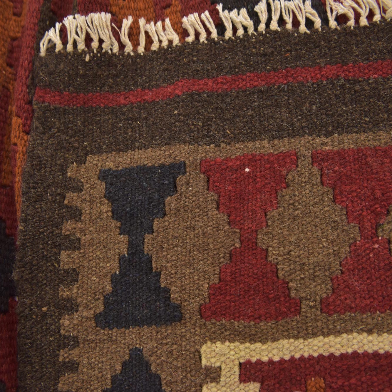 A 6 ft Kilim Maymana runner rug featuring a Southwestern geometric pattern in shades of red, orange, brown, and black.
