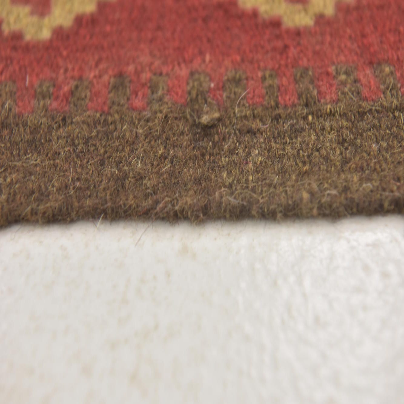 A 6 ft runner rug with a Southwestern, tribal pattern in reds, gold, and dark brown, featuring geometric diamonds.
