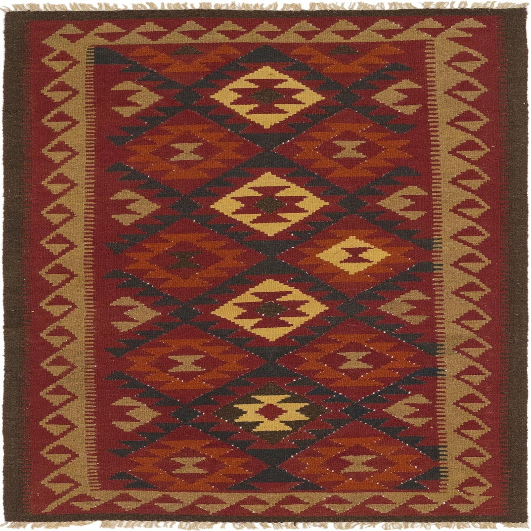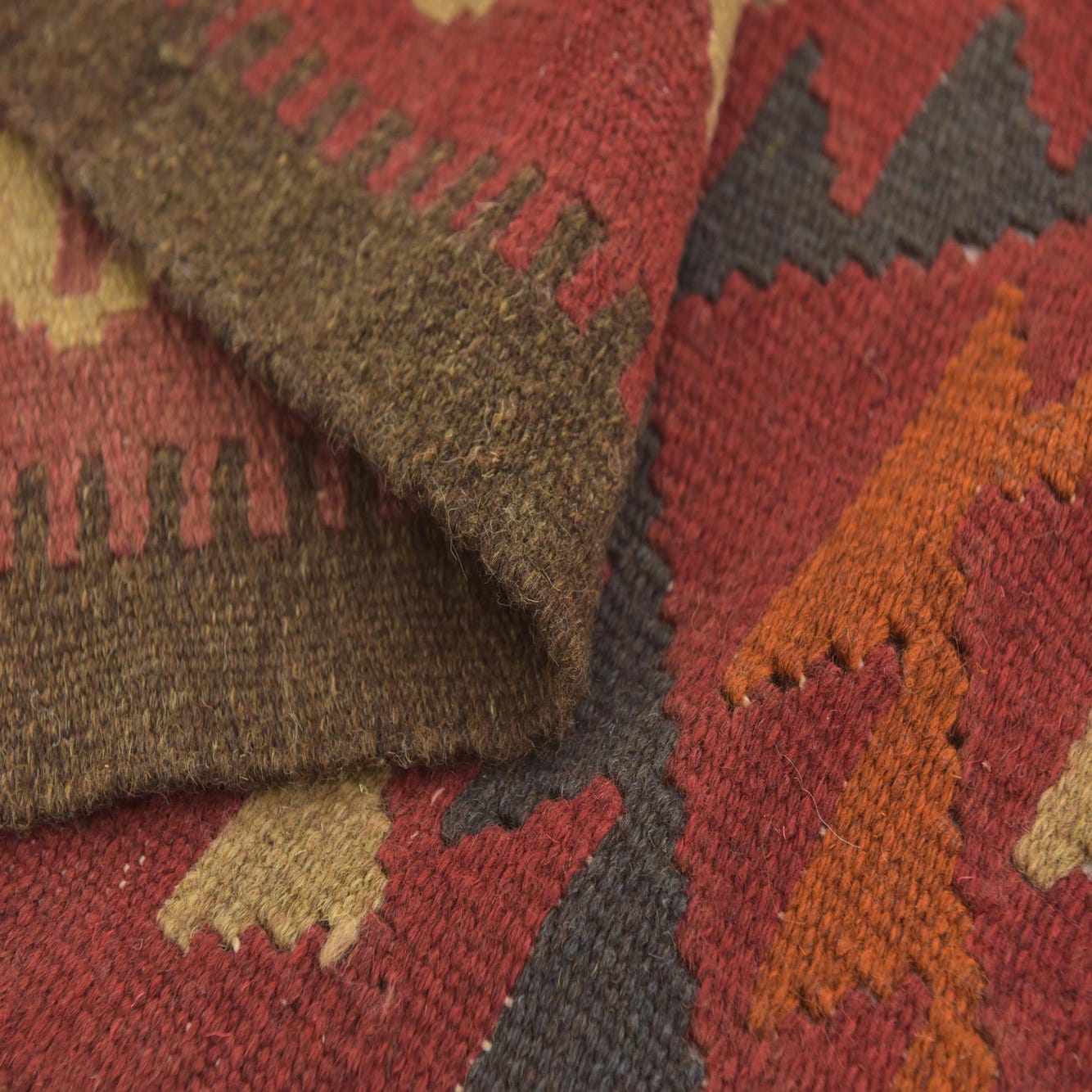 The Kilim Maymana collection presents a hand-woven 6-foot runner that embodies the traditional craftsmanship of kilim weaving. This runner showcases a geometric pattern characterized by diamond shapes and intricate motifs that reflect its cultural heritage. The design palette features earthy tones of red, beige, black, brown, cream, and hints of orange, with red serving as the dominant background color. The juxtaposition of these colors sets a warm and inviting tone.
