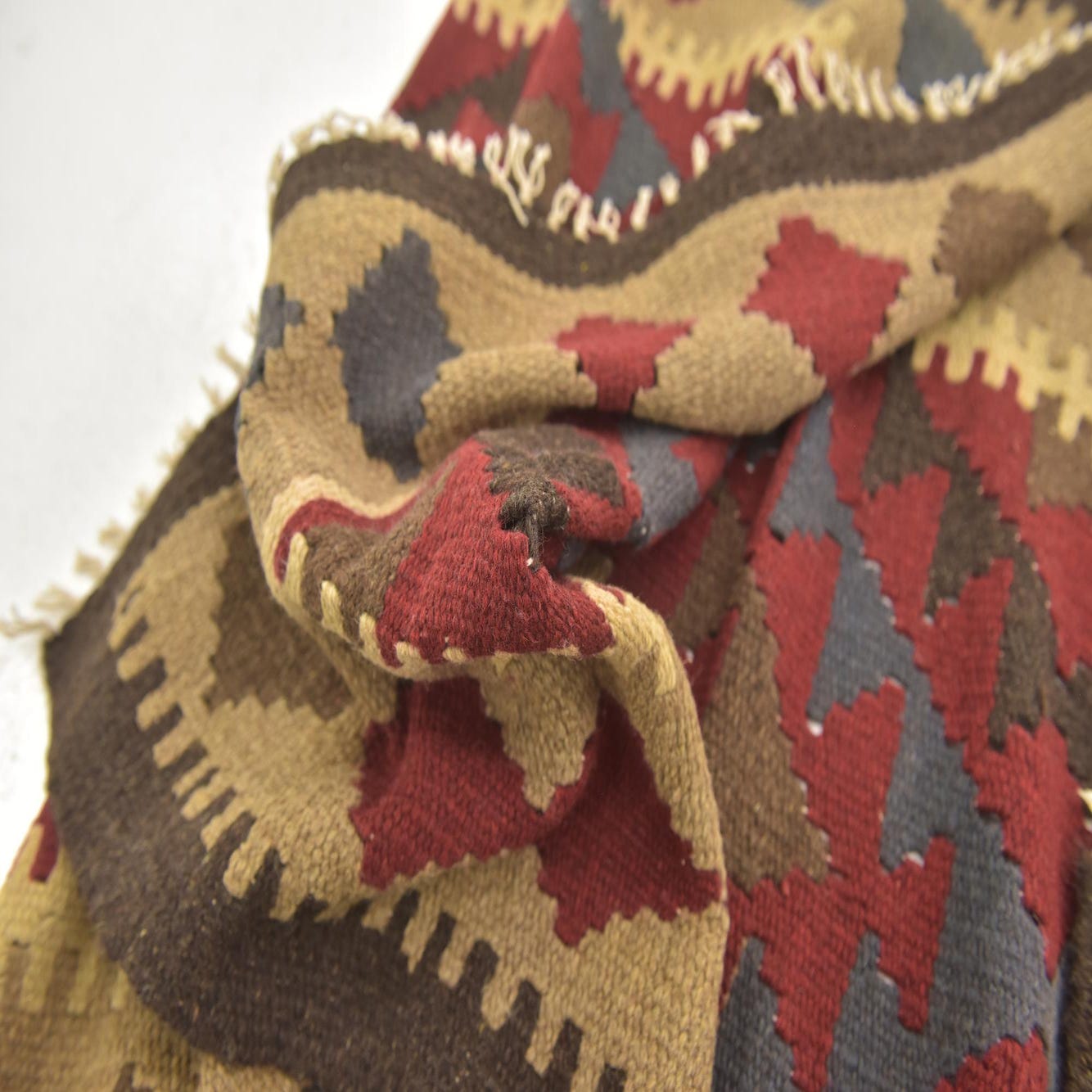A 6 ft Kilim Maymana wool runner rug featuring a Southwestern tribal pattern in reds, browns, blues, and gold.