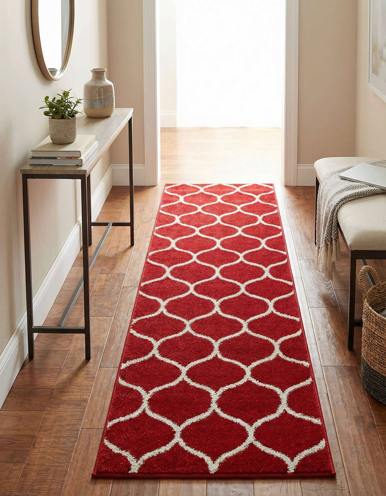 A deep red field anchors this runner with a repeating ivory lattice pattern that brings a touch of Moroccan-inspired geometry to the floor. The machine-made construction in 100% polypropylene gives the pile a plush, resilient hand, while the slightly higher, textured ivory lines create a subtle raised effect you can feel underfoot. The pattern’s rounded quatrefoil shapes keep the look modern yet approachable, and the color contrast adds clear visual definition without overwhelming the space.