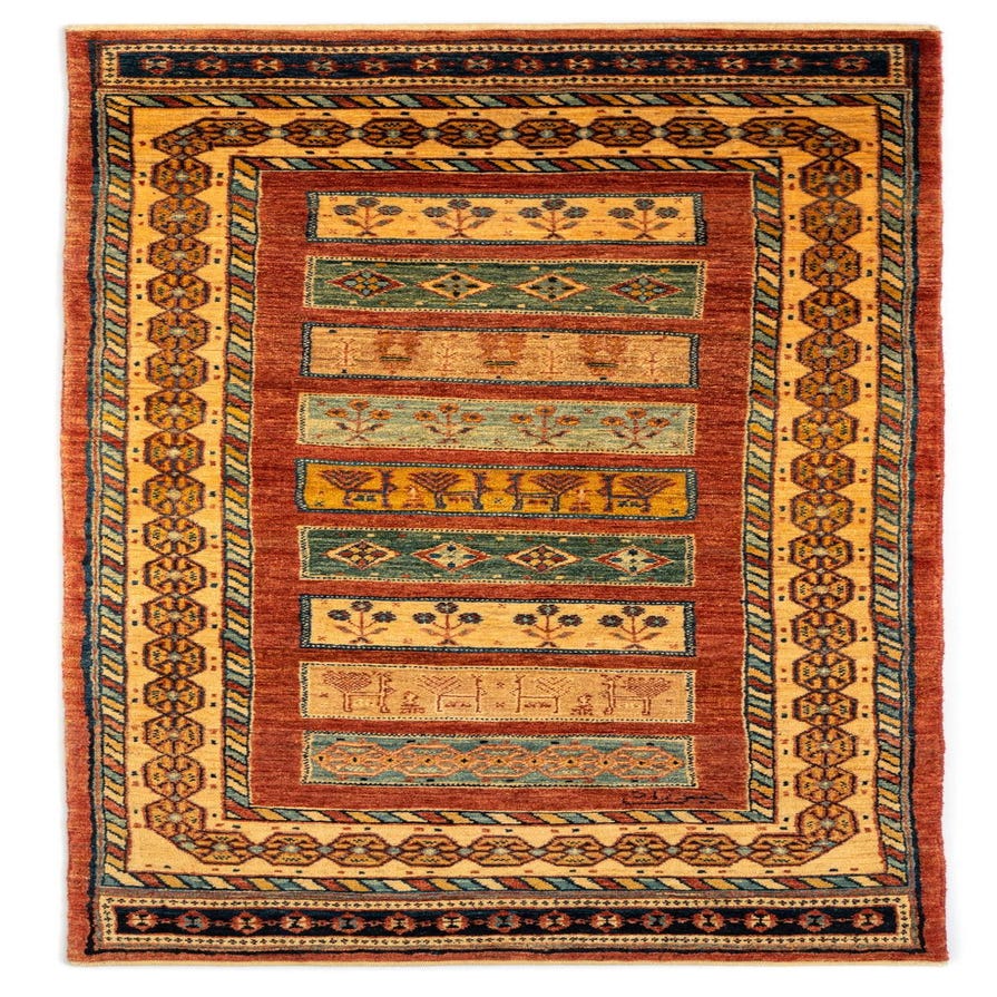 A 6 ft handmade red Persian runner rug with a gold border and colorful geometric and floral patterns.
