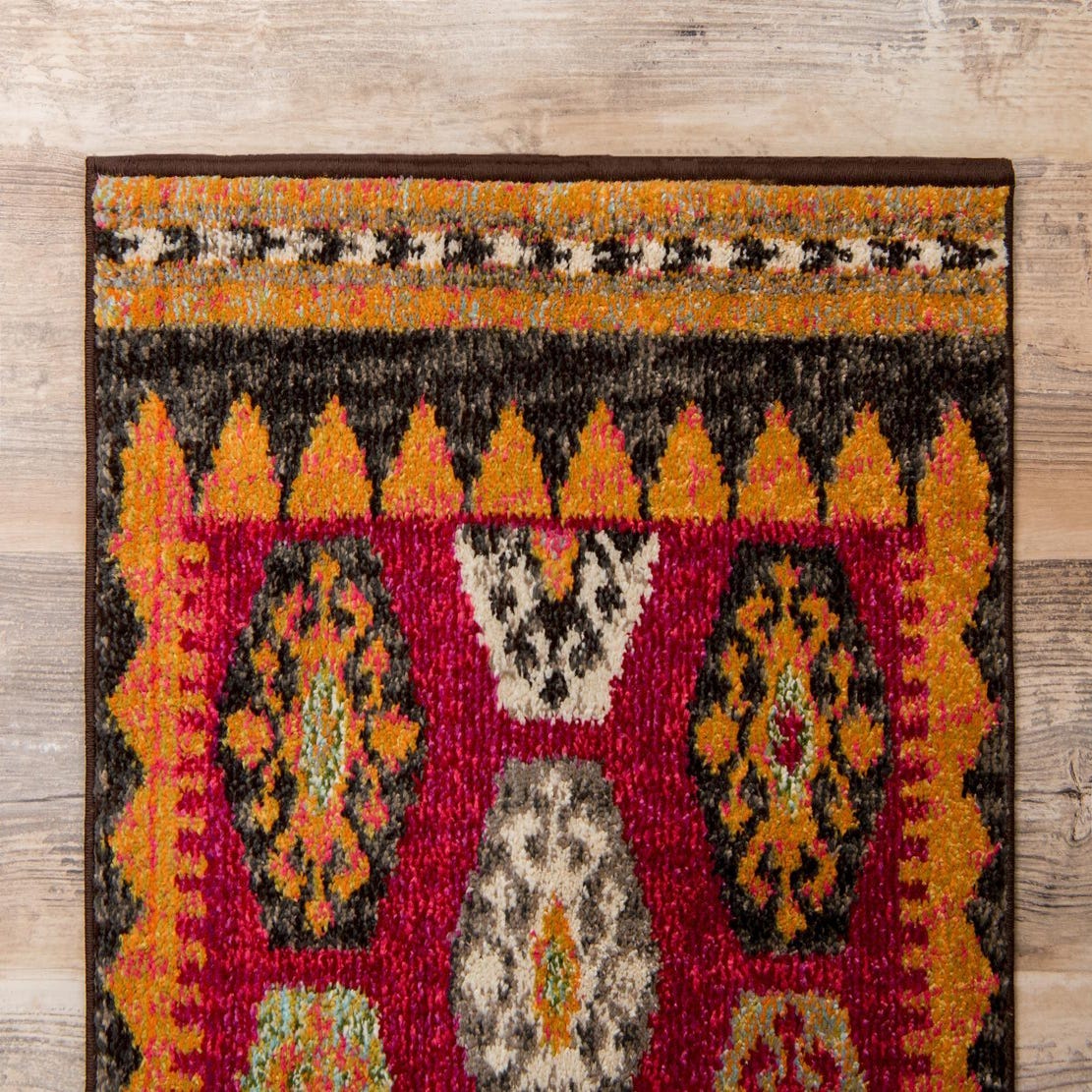 Primary color is Red. Colors in this rug include: Red, Brown, Green, Ivory, Orange, Peach, Puce, Yellow, Pink, Gray.
