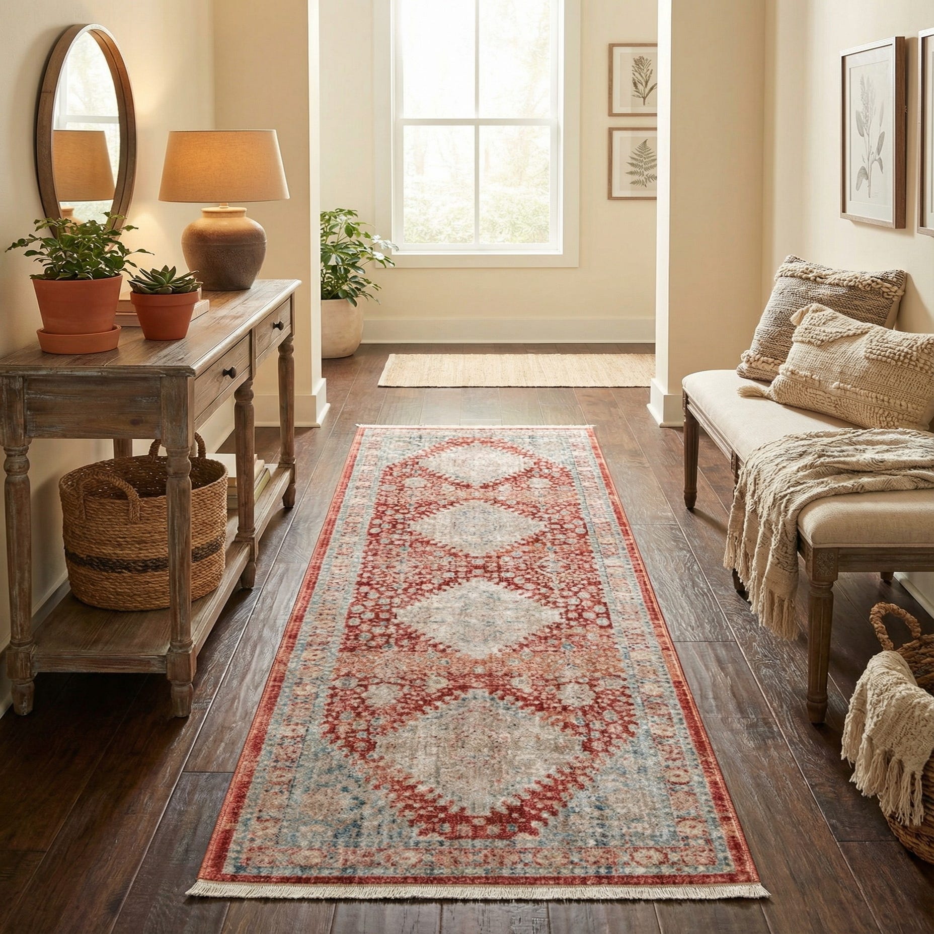 The rug is machine made from 100% polyester with a low-profile, soft pile that is pleasant underfoot and holds the pattern’s subtle, distressed color shifts. Sized as a runner, it works well in entryways and hallways, alongside a kitchen island, or layered at the foot of a bed. Pair it with warm wood tones and neutral upholstery for a relaxed traditional or transitional scheme, or combine it with brass accents and textured textiles for a vintage-inspired or bohemian setting.