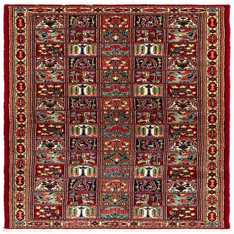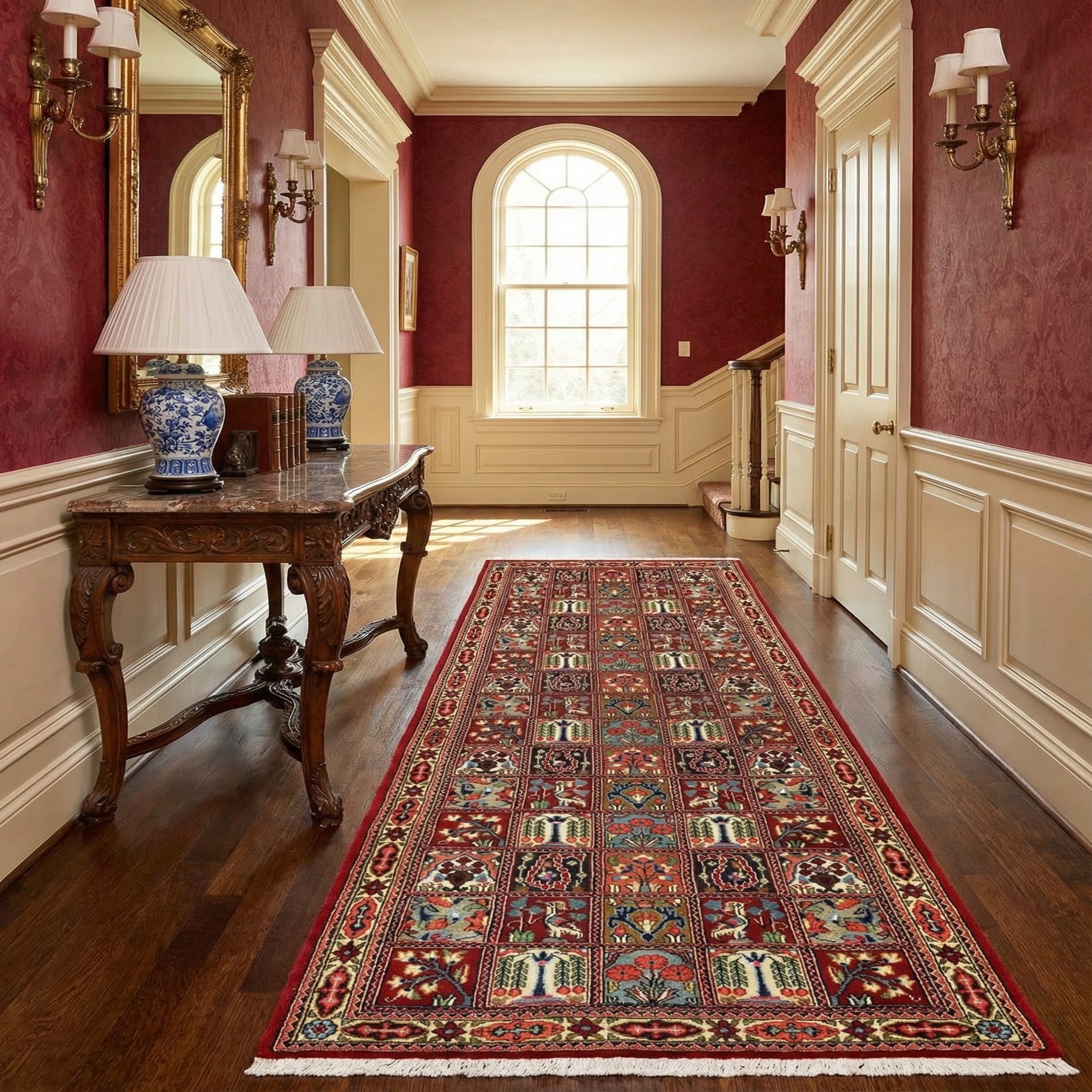A 6 ft red Persian runner rug with a grid pattern of intricate floral and bird motifs, ideal for a hallway.