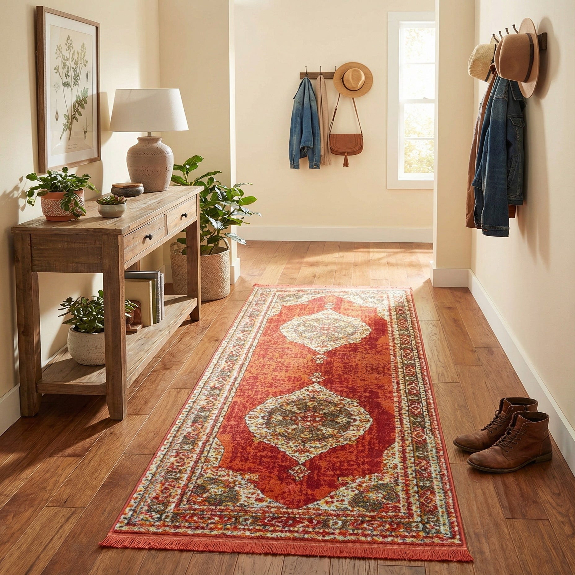 Machine-made from 100% polypropylene, the rug has a low, dense pile that feels smooth underfoot with a gentle, slightly lustrous surface. Use it to anchor a long hallway or entry, place it alongside a bed to add color and pattern, or run it through a kitchen or galley where a narrow footprint makes a big visual impact. Pair it with warm wood floors and leather accents for a Mediterranean or transitional look, layer it over a neutral sisal for a cozy eclectic mix, or let the red and terracotta tones provide a lively counterpoint in a contemporary neutral scheme.